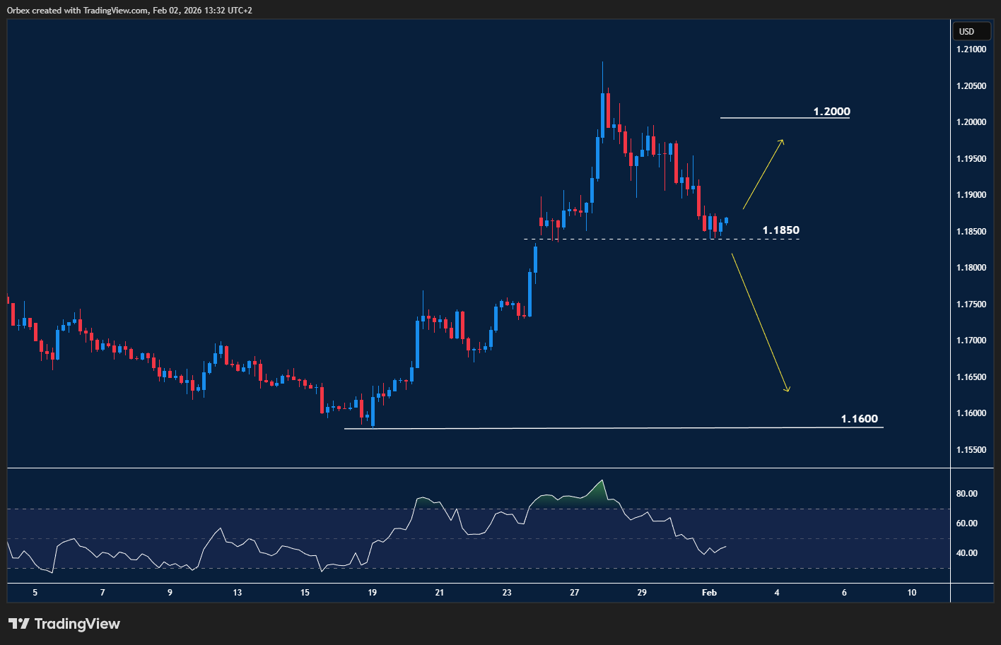 دخل اليورو في موجة تراجع هادئة بعد تقلبات سعرية حادة منحت الدولار تفوقاً بأكثر من 200 نقطة. يصارع الزوج حالياً للاستقرار فوق مستوى 1.1850، الذي بات يشكل خط دفاع حرجاً؛ فاستمرار هذه النبرة التشاؤمية قد يغري الدببة (البائعين) بزيادة ضغوطهم لإعادة اختبار قاع الشهر الماضي قرب مستويات 1.1600. وفي المقابل، فإن نجاح الزوج في التماسك فوق 1.1850 قد يمهد لانعكاس المسار والعودة لاختبار القمة عند 1.2000.