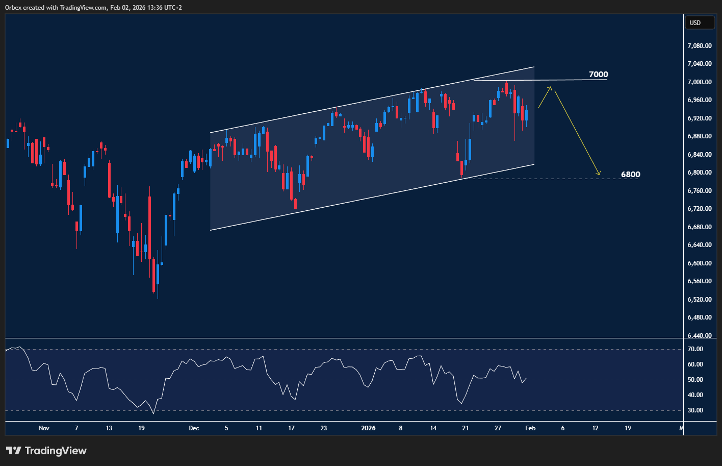 شق مؤشر ستاندرد آند بورز طريقه نحو قمة غير مسبوقة قبل أن تصدّه المقاومة الشرسة عند الحاجز النفسي 7000 نقطة. تقف حركة السعر الآن في منطقة “مخاض” ستحدد ملامح التداول للربع الأول من العام الجديد. فالاختراق الصعودي سيفجر شرارة “رالي” متسارع يجذب متداولي الزخم ويفتح شهية الأسواق لقمم جديدة. وعلى المقياس الآخر، فإن أي كسر لمستويات 6800 قد يطلق موجة من جني الأرباح القسري ويدفع البائعين لتكثيف مراكزهم. هذا ما قد يضع المؤشر في مهب تصحيح سعري.