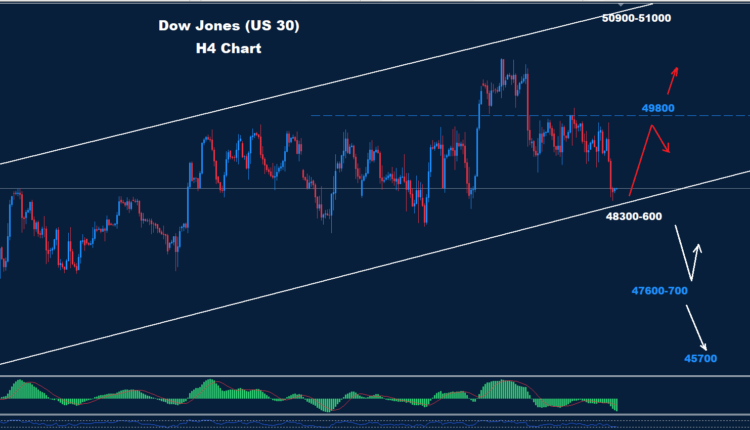 لا نزال نتمسك بتوقعاتنا السابقة لمؤشر داو جونز. تمكن السوق من الحفاظ على استقراره فوق مستوى دعم الترند ، حيث ارتدّ نحو 49290 حتى الآن. كما نرى في الرسم البياني السابق، وطالما بقي السوق فوق مستوى 600-48300 ، فهناك فرصة لتصحيح ارتدادي إضافي نحو مستوى 900-49800. أما إذا انخفض دون مستوى 48300، فمن المتوقع حدوث مزيد من الانخفاض.