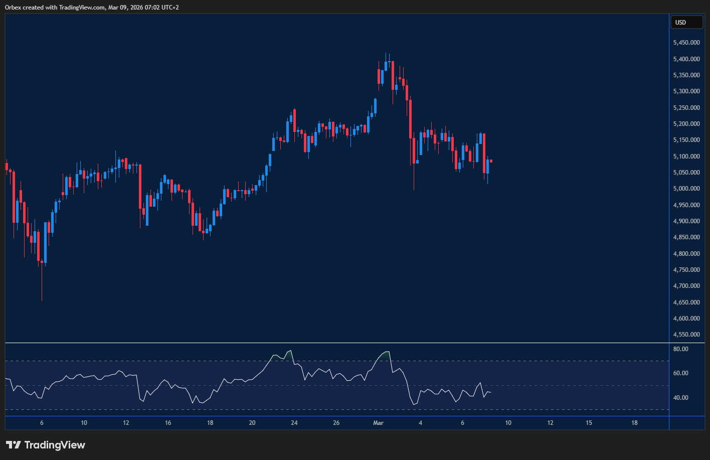 في البداية، حفزت بيانات العمل الأمريكية أسعار الذهب للصعود، حيث استغل المستثمرون أول قراءة سلبية منذ أكتوبر الماضي. ومع ذلك، أدى الانعكاس الكامل في الاتجاه إلى عودة المعدن الأصفر لاختبار مستويات الدعم الحرجة مرة أخرى. ومع دخول التوترات في الشرق الأوسط أسبوعها الثاني، تظل الأسعار عرضة لتقلبات سعرية حادة. وتمثل منطقة المقاومة الصلبة عند 5200، والتي تم الوصول إليها في القفزة السابقة، المستهدف الصعودي القادم. بينما يبدو أن مستوى 5000 سيعمل كقاعدة دعم متماسكة في المدى المنظور.