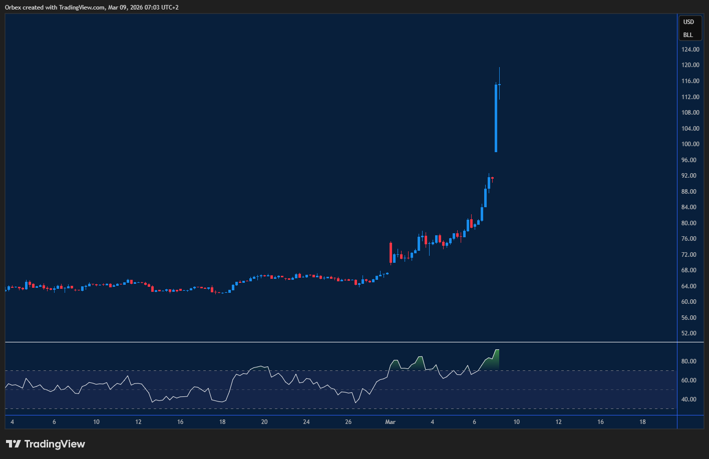 سجلت أسعار النفط طفرة سعرية بنسبة 30% مع افتتاح الجلسات، بالتزامن مع وصول التوترات الجيوسياسية إلى ذروتها. ومع ترقب الأسواق للتطورات الميدانية، شهد إنتاج الخام في منطقة الخليج العربي تراجعاً ملحوظاً. وفي ظل غياب أي أفق للحل في الوقت الراهن، يُتوقع أن يواصل النفط مساره الصاعد نحو مستويات سعرية لم تُسجل منذ بداية النزاع الروسي الأوكراني قبل أربعة أعوام. وتستهدف الموجة الصعودية القادمة مستوى 130 دولاراً، مع تحول حاجز 100 دولار إلى مستوى دعم فني جديد.