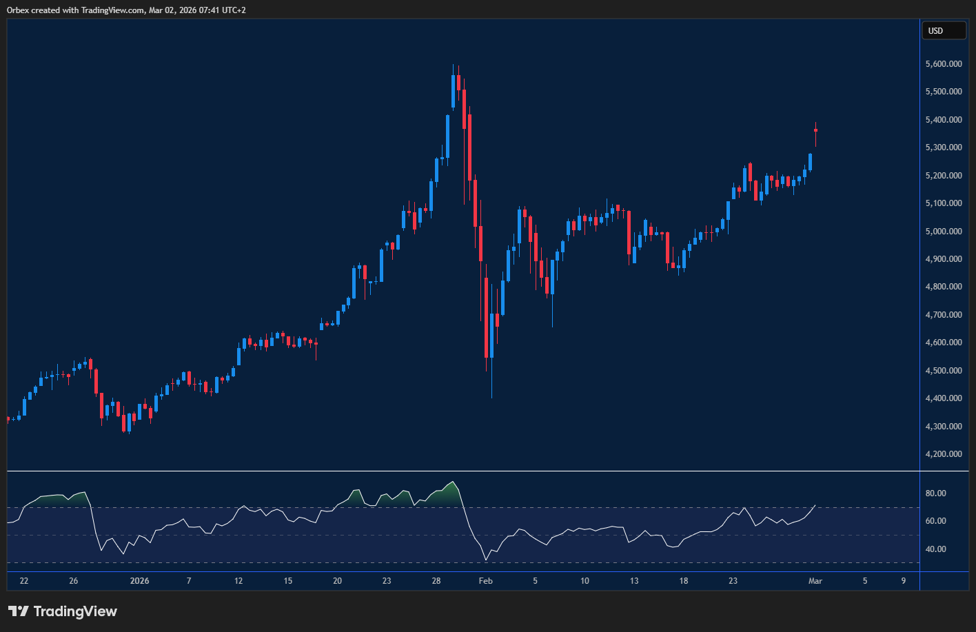 يعمل متداولو الذهب حالياً على استيعاب التداعيات الناجمة عن الرسوم الجمركية العالمية وتصاعد حدة الصراعات. وبطبيعة الحال، أدت أنباء اندلاع صراع جديد خلال عطلة نهاية الأسبوع إلى قفزة هائلة في أسعار المعدن الأصفر، حيث حلق عالياً بأكثر من 100 دولار عند افتتاح التداولات. وفي ظل هيمنة المخاطر العالمية على المشهد العام، تبرز المقاومة الصلبة عند القمة السابقة قرب مستويات 5400 كعقبة فنية يصعب تجاوزها، بينما يظل مستوى 5000 يمثل منطقة دعم استراتيجية تحول دون دخول الذهب في طور تصحيحي أعمق في الوقت الراهن.