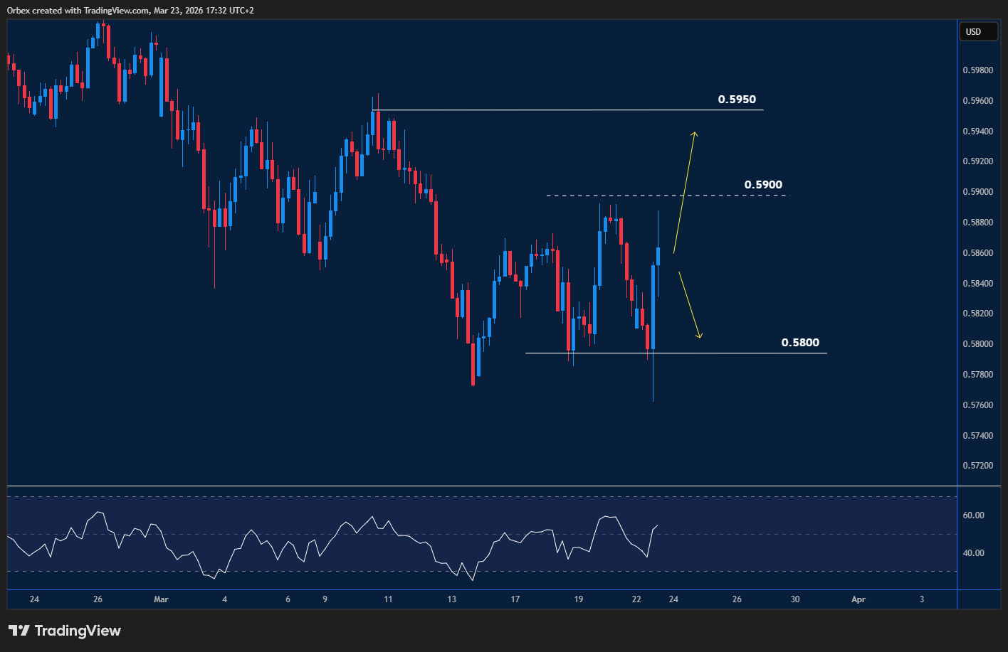 على غرار نظيره الأسترالي، يواصل الدولار النيوزيلندي اندفاعه نحو مستويات أعلى. وعلى الرسم البياني، يجري الزوج محاولة جديدة لاختبار الاختراقات الفاشلة لنموذج القمة المزدوجة السابق، وتحديداً دون مناطق 0.5900. غير أن صلابة المقاومة عند ذلك المستوى توحي بوجود متسع لحركة تصحيحية متراجعة. ومن شأن أي هبوط دون مستوى 0.5840 أن يجهض الموجة الصعودية، وهو ما قد يطلق شرارة موجة بيعية جديدة بالتزامن مع ظهور انحراف هبوطي على مؤشر القوة النسبية. وفي حال انهيار حركة السعر، سيكون مستوى 0.5800 هو المحطة الاستهدافية القادمة للقوة البيعية.