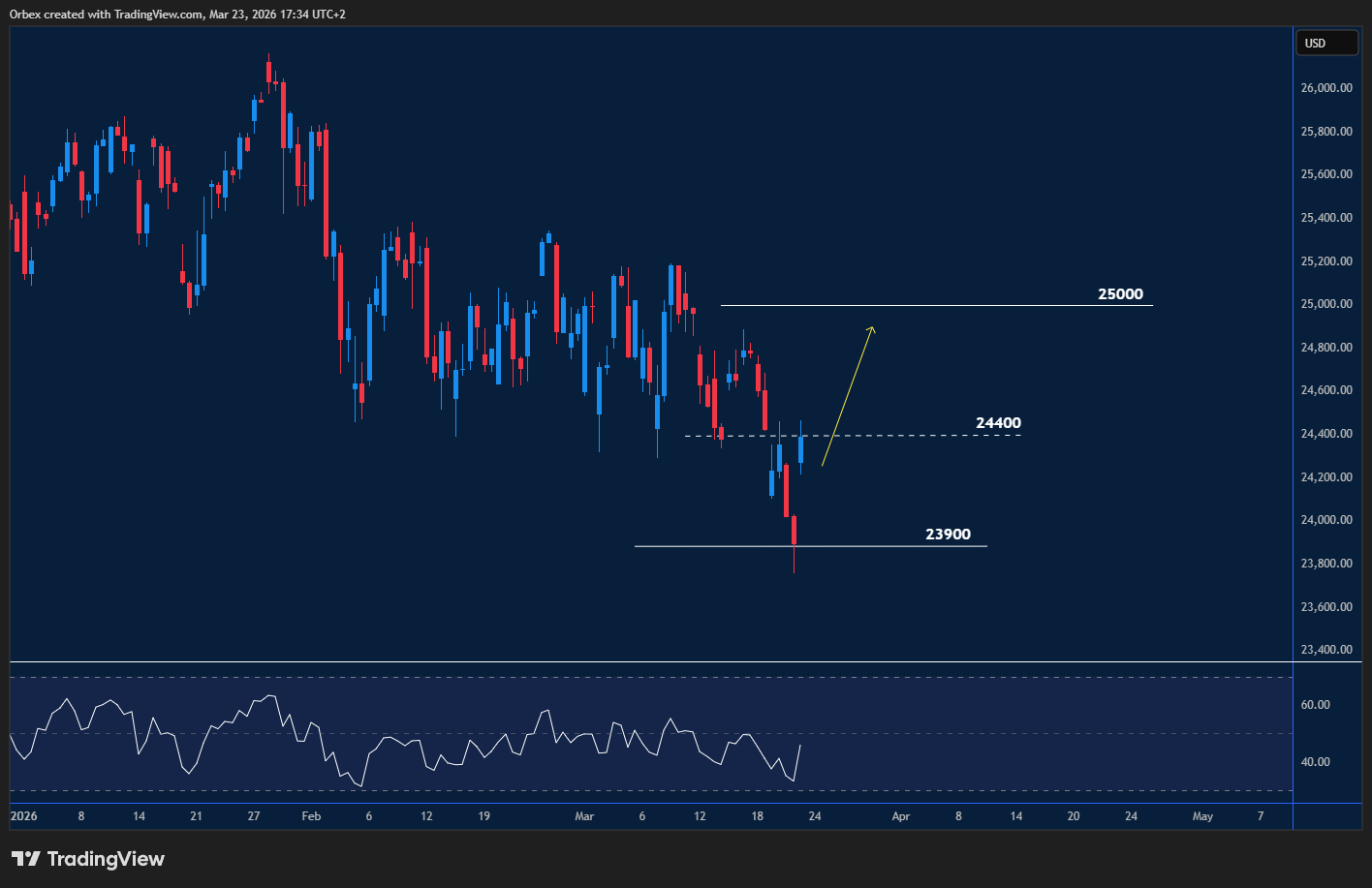 فقد مؤشر ناسداك المزيد من زخمه في ظل استمرار فتور المعنويات على خلفية خطط الصراع التي يتبناها دونالد ترامب. وجاء الكسر دون حاجز 24000 ليؤكد تكبد خسارة يومية جديدة، مما يعكس إصراراً أكبر من جانب البائعين على التمسك بالميل الهبوطي. ومع ذلك، نجح الانحراف الصعودي الطفيف لمؤشر القوة النسبية حتى الآن في كبح أي محاولة لاختراق مستدام لمستوى 23900، والذي يُعد دعماً جوهرياً للحفاظ على توازن الأسعار. ومن شأن العودة لتجاوز مستويات 24400 أن تبعث بعض الأمل في نفوس المشترين الطامحين لدفع الأسعار نحو حاجز 25000.