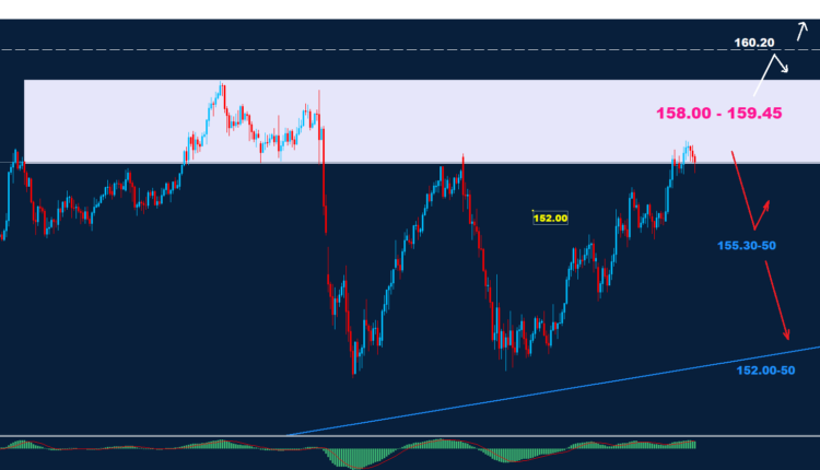 كما هو موضح في الرسم البياني، يواجه السوق منطقة رمادية عند 158.00 – 159.45 والتي قد تعطي عندة احتمالات للحركة القادمه، والتي تُعتبر منطقة مقاومة، مما قد يُبقي على احتمالية حدوث موجة هبوط أخرى نحو 50-155.30 و 50-152.00.