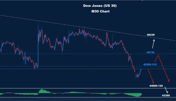 سيواجه السوق مقاومة عند مستوى 315-45260 وعند مستوى 45730، وطالما استمر مؤشر داو جونز في التداول دون أحد هذين المستويين، فقد يستمر ضغط الهبوط باتجاه مستوى 135-44000.