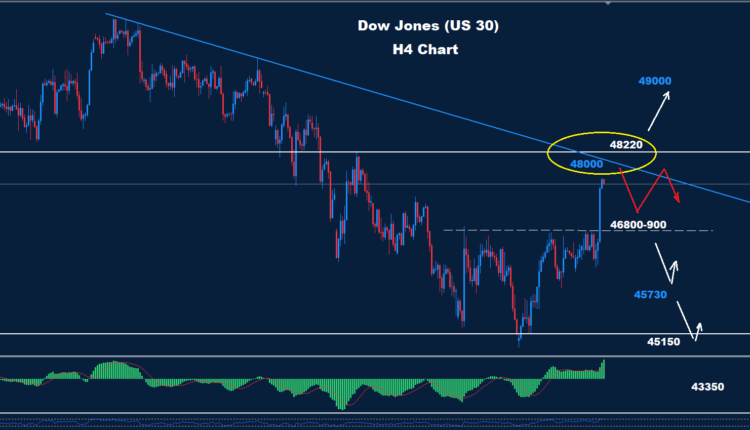 لا نزال نحتفظ بتوقعاتنا السابقة لمؤشر داو جونز. تمكن السوق من تجاوز مستوى المقاومة 46900، مما دفعه لمزيد من الارتفاع، كما اختبر منطقة المقاومة 220-48000 و اكثر. كما هو موضح في الرسم البياني، تقع منطقة المقاومة حول 220-48000 ، بينما يقع مستوى الدعم عند 900-46800 ، مما قد يُبقي السوق ضمن هذه المنطقة. في حال تجاوز مستوى 48320، قد يرتفع السوق أكثر باتجاه 49000. في حال انخفاضه دون مستوى 46800، قد يشهد السوق مزيدًا من الانخفاض.