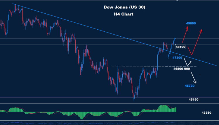 تمكن مؤشر داو جونز من تجاوز مستوى 48320، مما قد يؤدي إلى مزيد من الارتفاع كما سبق ذكره. وكما هو موضح في الرسم البياني، يواجه السوق مستويات دعم عند 48100 و47300، حيث قد يُسهم أحد هذين المستويين في دعم موجة الصعود نحو الهدف 49000. أما في حال انخفاض المؤشر عن مستوى 47300، فقد يشهد السوق مزيدًا من الهبوط، مع وجود دعم عند مستوى 900-46800.