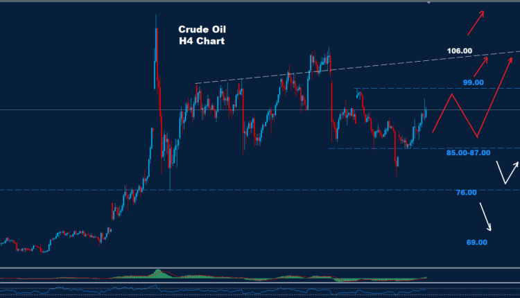 كما هو موضح في الرسم البياني، يواجه السوق فرصة للتداول ضمن نطاق الدعم 87.00 – 85.00 ومستوى المقاومة 99.00 قبل استمرار الصعود، شريطة استمرار إغلاق مضيق هرمز.