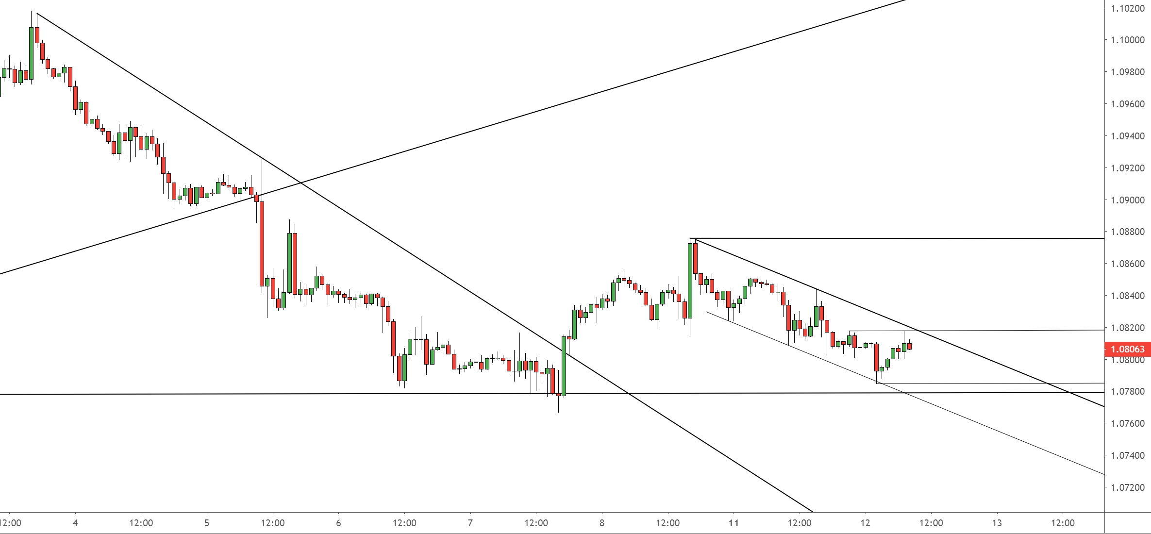 Das Währungspaar EURUSD kämpft weiterhin um seine historische Major-Unterstützung bei 1,0778 USD. Der Abwärtstrendkanal begünstigt aber auch heute einen unteren Ausbruch nicht. Deshalb können sich bei 1,0778 oder am letzten Zwischentief bei 1,07846 USD auch wieder False-Breakouts und damit antizyklische Entrychancen auf der Longseite ergeben. – Ein prozyklisches Kaufsignal entsteht mit dem Bruch des Abwärtstrends bei 1,0819-1,0799 und einem gleichzeitigen Ausbruch über den Widerstand bei 1,08176 USD. Daraus resultieren dann erweiterte Erholungschancen bis erneut zum Widerstand bei 1,08756 USD, bevor dort dann aber auch wieder ein oberes False-Breakout und Reversal drohen.
