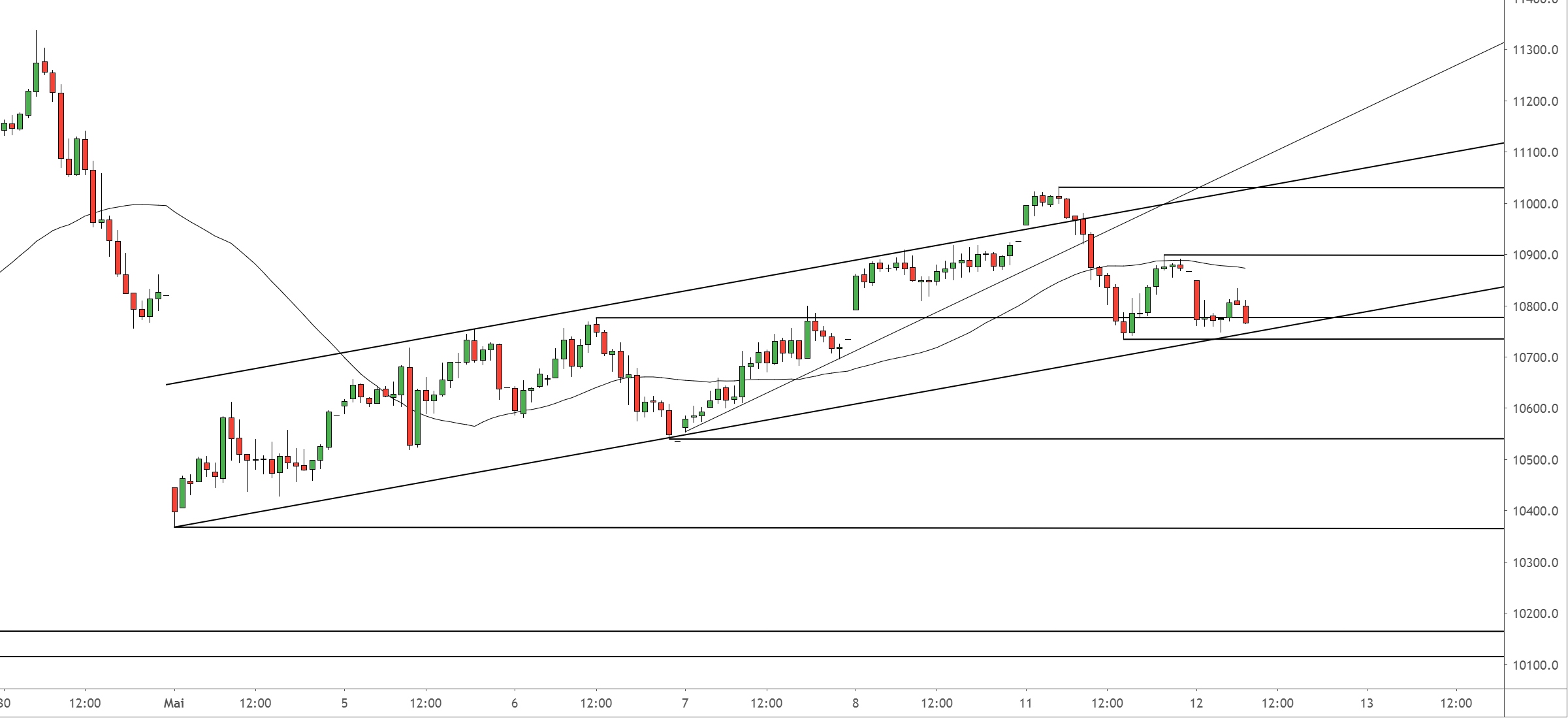 Der GER30 nähert sich nach dem schwachen Wochenauftakt erneut seinen unteren Ausbruchssignalen an. Dabei geht es um die beiden Horizontalen bei 10.776 und 10.734, sowie vor allem auch um den Aufwärtstrend bei 10.745-10.783 Punkten. Ein Ausbruch würde zum bearishen Setupwechsel führen und neue Türen nach unten aufmachen. Die nächsten Unterstützungen finden sich dann erst wieder bei 10.542 und 10.367,5 Punkten. – Ein False-Breakout und Reversal an dieser Ausbruchszone bringt hingegen ein erstes Longsignal. Das könnte also etwas knifflig werden heute. Andere Longsignale gibt es zunächst leider nicht. Das maximale Aufwärtspotential reicht erneut bis zum gestrigen Hoch bei 11.030,5 und damit auch wieder bis zum Kanal. Obere False-Breakouts und Shortsignale können sich am gestrigen Erholungshoch bei 10.898,5 und 11.030,5 ergeben.