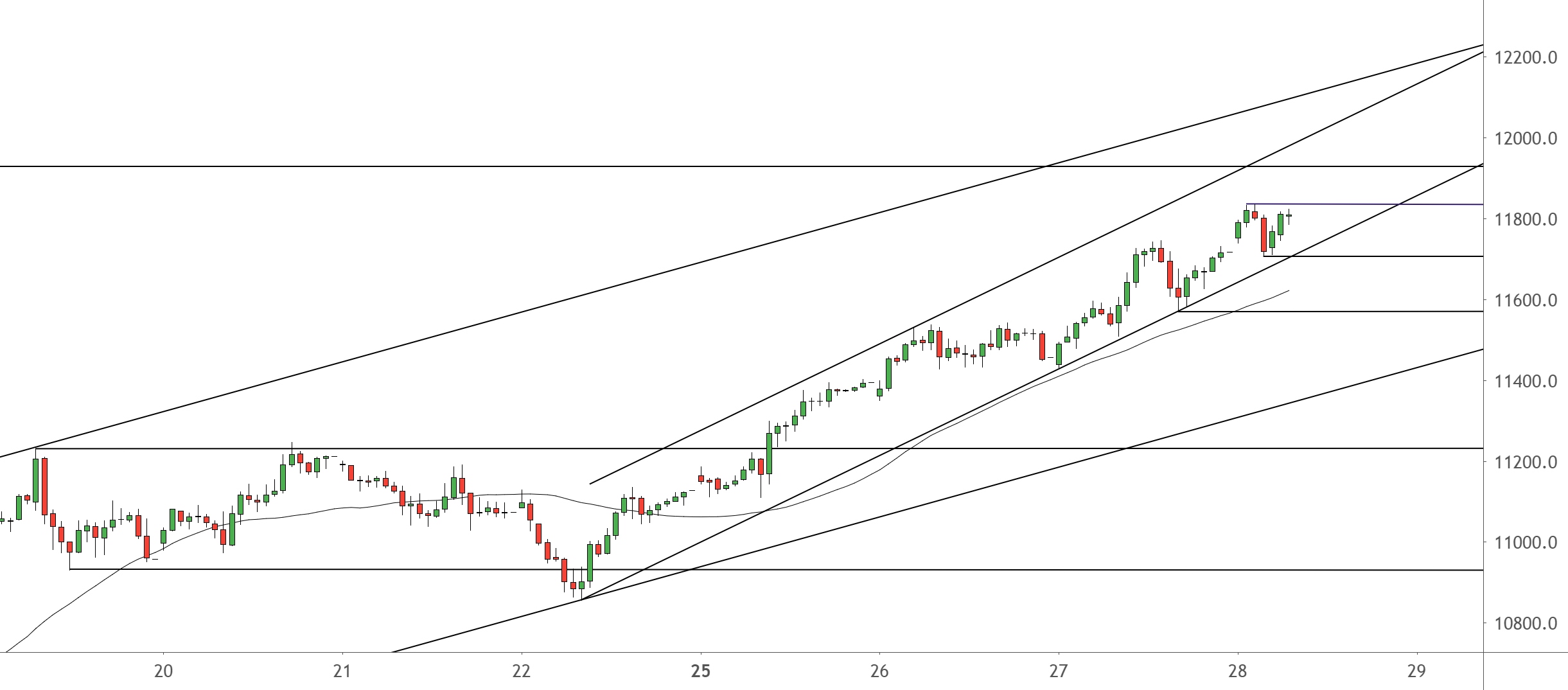 Der GER30 kann seine Aufwärtsrallye bis heute Morgen fortsetzen. Doch nun gibt es erste Ermüdungssymptome. An der Oberseite steht heute die Horizontale bei 11.930 im Fokus, wo im Tageschart ein mehrwöchiger Aufwärtstrendkanal verläuft. Das ist sicherlich ein prädestiniertes Ziel. Und nur darüber gehen noch einmal neue Türen auf. Sobald sich ein neues Hoch über 11.833,5 aber nicht mehr durchsetzen kann, droht fortan auch ein Bruch des Aufwärtstrends bei 11.715-11.840. Dieses Verkaufsignal steht nicht für eine dauerhafte Trendwende, aber für ein übergeordnetes Konsolidierungssignal. Die ersten potentiellen Zielunterstützungen sind dabei die letzten Reaktionstiefs 11.706 oder 11.569,5. Insgesamt ist vor Pfingsten aber mehr mit einer Seitwärtskonsolidierung zu rechnen als mit einer besonders scharfen Korrektur.