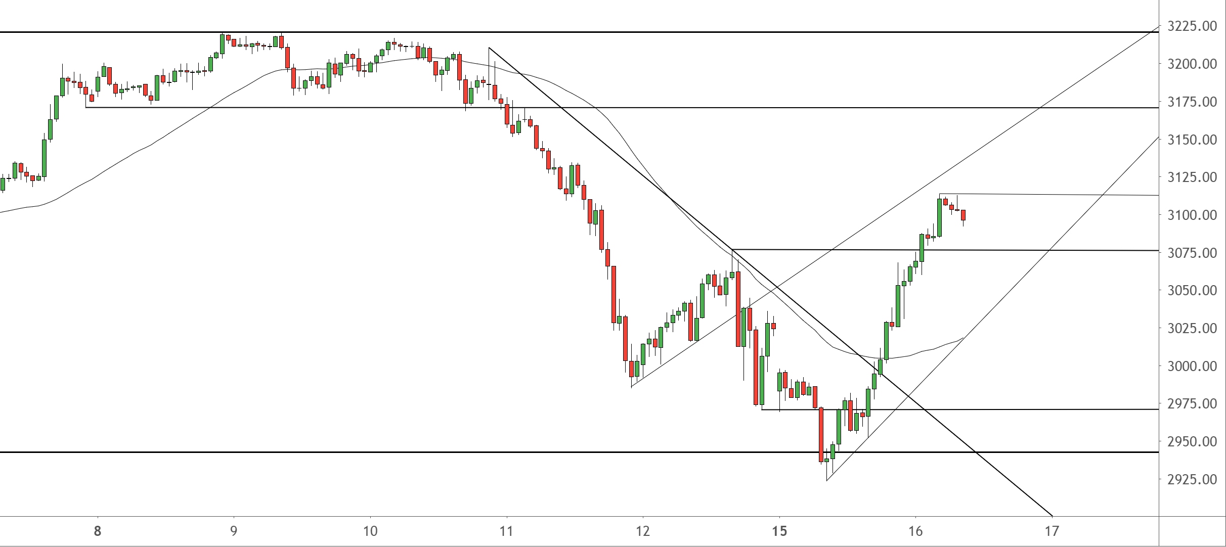 Nach der fulminanten Erholungsrallye des Vortages erscheint diese beim SPX500 nun jedoch zunehmend ausgereizt. Allerdings kündigt sich auch kein Trendwechsel aus dem Stand an. Ein weiteres High über dem letzten bei 3.113,5 Punkten ist daher durchaus wahrscheinlich. Erst wenn sich dieses nicht mehr durchsetzen sollte, kommt die Rallye deutlicher ins Stocken, und es ergeben sich daraus auch erste Chancen auf der Gegenseite. Nur bestenfalls kann die Rallye jetzt noch weiterlaufen bis zum Major-Widerstand bei 3.171 Punkten. – Wo eine Gegenbewegung im späteren Tagesverlauf, von der hohen Volatilität geprägt, hinführen soll, verrät der Stundenchart mangels Unterstützungsthemen noch nicht. Lediglich bei 3.056,75 gibt es eine leichte Unterstützung. Interessant könnte auch schon wieder das Konsolidierungstief werden, das der SPX500 bis zur Stunde ausbildet.