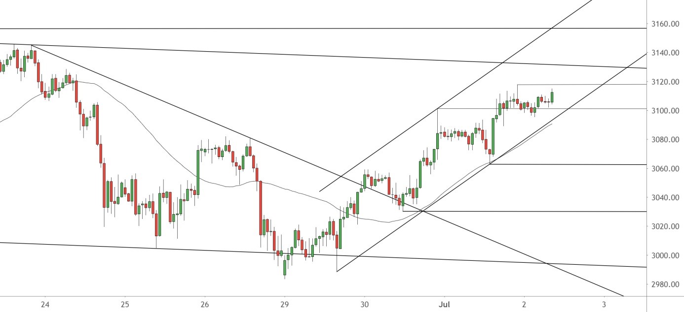 Heute um 14:30 Uhr steht in den USA mit den monatlichen Arbeitsmarktdaten die wichtigste Wirtschaftszahl des ganzen Monats an. Deshalb ist bis dahin mit einem eher ruhigen und abwartenden Handel zu rechnen. Beim SPX500 dürfte es daher weder zum Bruch des Aufwärtstrends bei 3.093-3.115 und damit zu einem Verkaufsignal kommen. Noch dürfte es auf der anderen Seite einen Ausbruch über den flachen Abwärtstrend seit dem 16.06. bei 3.132-3.131 geben. Das ist also die offensichtliche Trading-Range mit zunächst nur überschaubaren Chancen auf beiden Seiten. – Am Nachmittag werden die Karten dann neu gemischt. Noch ist die Stoßrichtung bullish. Und bei einem Ausbruch über den Abwärtstrend sollte als nächstes zügig auch der Major-Widerstand bei 3.156,25 erreicht werden. Nach einem Trendbruch-Verkaufsignal verlaufen die nächsten Auffanglinien bei 3.062,75 und 3.030,25 Punkten.