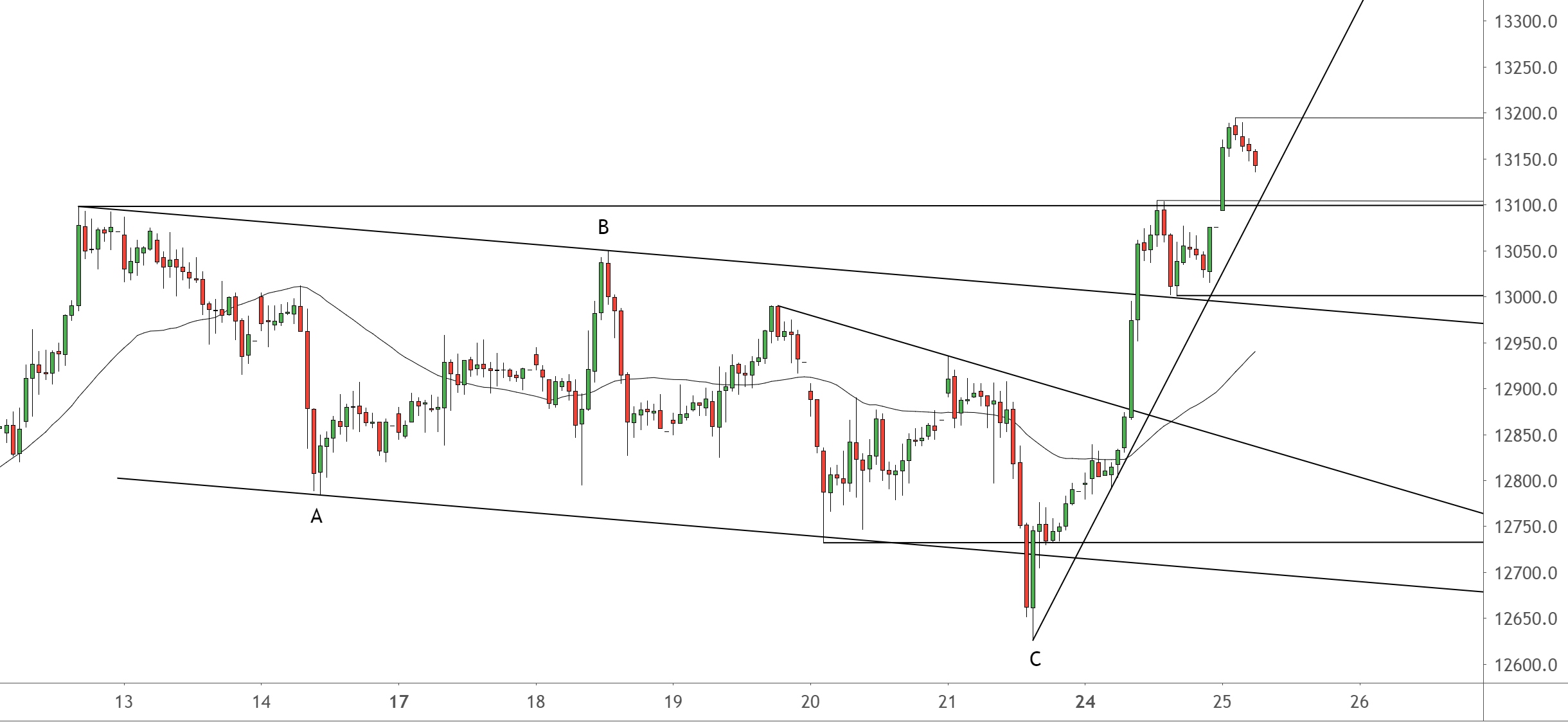 Auch beim GER30 wird der steile Rallyetrend den Handelstag kaum überleben. Eine Korrektur und schwächere Kurse führen aber auch beim GER30 wieder zu Kaufkursen und nicht zu einem übergeordneten Trendwechsel. Sobald sich heute ein neues Hoch über 13.194,5 nicht durchsetzt, bringt das vermutlich die einzige gute Chance auf der Shortseite. – Wann auch immer der Aufwärtstrend bei zur Stunde 13.110 gebrochen wird, bringt bereits die starke Majorzone bei 13.098 und 13.104 erste strake Unterstützung mit antizyklischen Chancen auf der Longseite. – Alternativ dazu gibt es am gestrigen Reaktionstief bei 13.001 und am Pullback an den Abwärtstrend bei 12.990-12.983 eine zweite und noch stärkere Auffangzone. Spätestens dort ist der GER30 wieder ein antizyklischer Kauf.