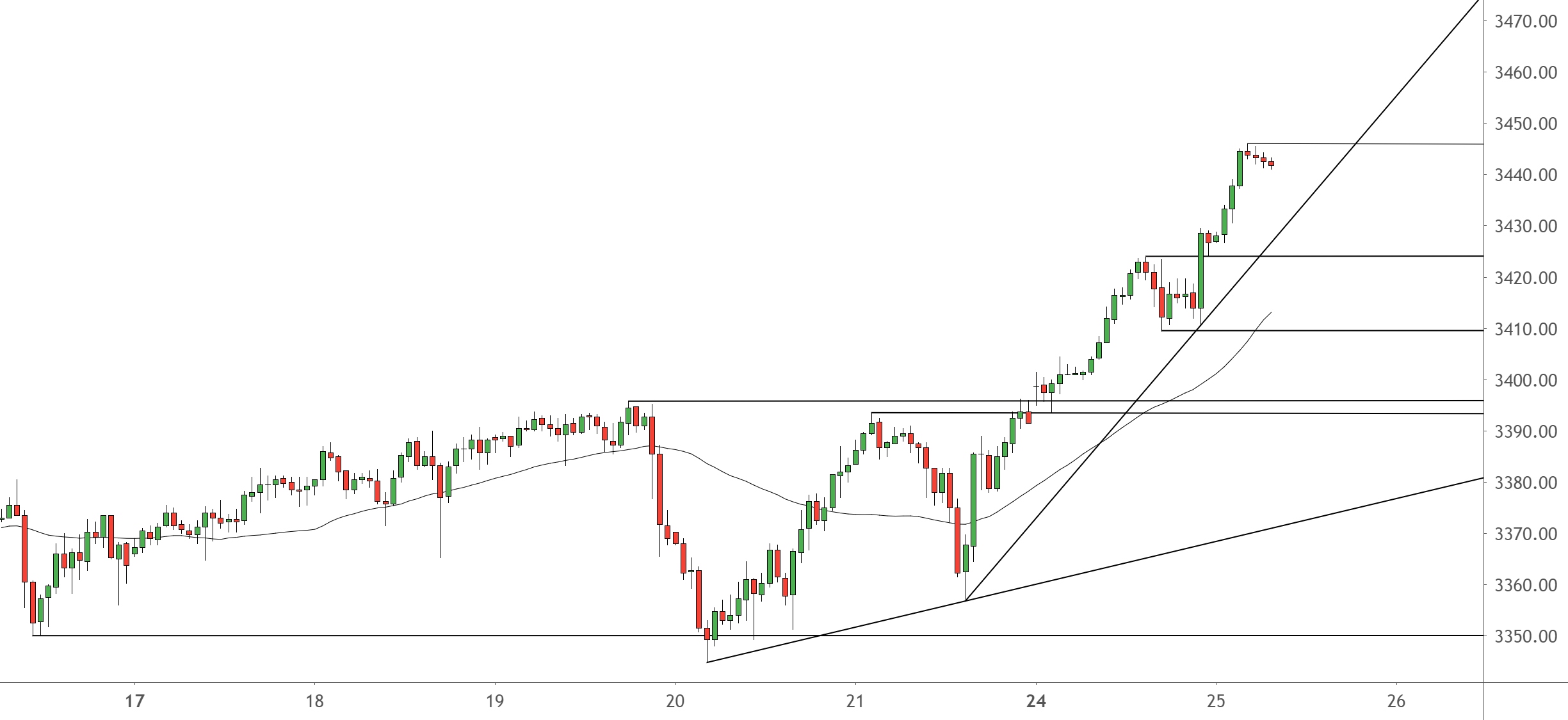 Trotz der Superrallye vom Montag erscheint die Aufwärtsrallye beim SPX500 noch nicht ausgereizt. Vorsicht also mit dem Dagegenhalten! Auch wenn das andererseits kein attraktives und aussichtsreiches Kaufniveau mehr ist. Doch erst wenn sich das nächste Hoch über dem von heute Nacht bei 3.446 nicht durchsetzt, lässt das Aufwärtsmomentum spürbar nach, und ein Bruch des Aufwärtstrends bei aktuell 3.429 wird absehbarer. – Auch wenn es im Tagesverlauf nicht unwahrscheinlich zum Trendbruch-Verkaufsignal kommen wird, bedeutet das keine übergeordneten Trendwende! Die Toleranzen bis zu einem übergeordneten Setupwechsel reichen sogar bis zur Majorzone bei 3.393,5 und 3.395,75. Wahrscheinlicher wird eine erste Gegenbewegung aber schon viel früher enden. Als Zielthemen dafür bieten sich die Unterstützungen bei 3.424 oder äußerst 3.409,5 an. Das wird so schnell kein Shortmarkt werden! Schwächere Kurse sind Kaufkurse!