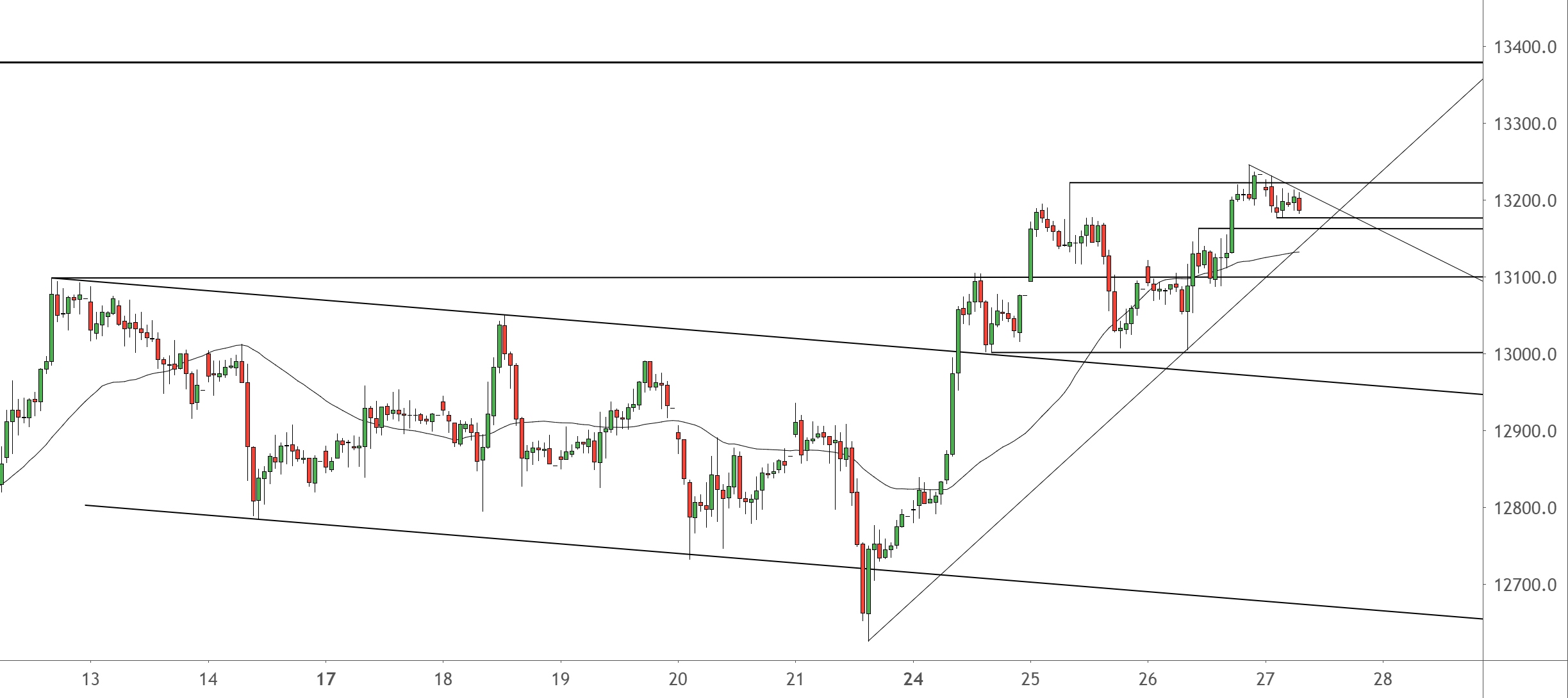 Beim GER30 wird es heute bereits zeitnah ein erstes Richtungssignal geben. Für neue Kaufsignale stehen dabei der kurzfristige Abwärtstrend bei um 9:00 Uhr 13.209 und erneut das markante Dienstagshoch bei 13.222. Nach diesem doppelten oberen Ausbruch ist der Weg nach oben wieder leicht und widerstandslos auf. Starker Widerstand tritt erst wieder bei knapp 13.380 ins Bild. – Sobald sich ein neues Hoch über dem gestrigen bei 13.242,5 auf Stundenbasis nicht durchsetzt, gerät die Rallye vorzeitig ins Stocken. – Nach dem unvorteilhaften False-Breakout am Dienstagshoch bei 13.222 sollten die Kaufsignale unbedingt abgewartet werden. Denn wenn der GER30 im Gegenzug unter die Unterstützungszone bei 13.162,5/13.176,5 weggeht und damit auch den Aufwärtstrend knapp darunter bricht, wechselt er heute erst einmal wieder in den Korrekturmodus. Unterstützungen finden sich dann im Bereich von 13.098 oder sogar erst wieder an der großen Basis bei 13001.