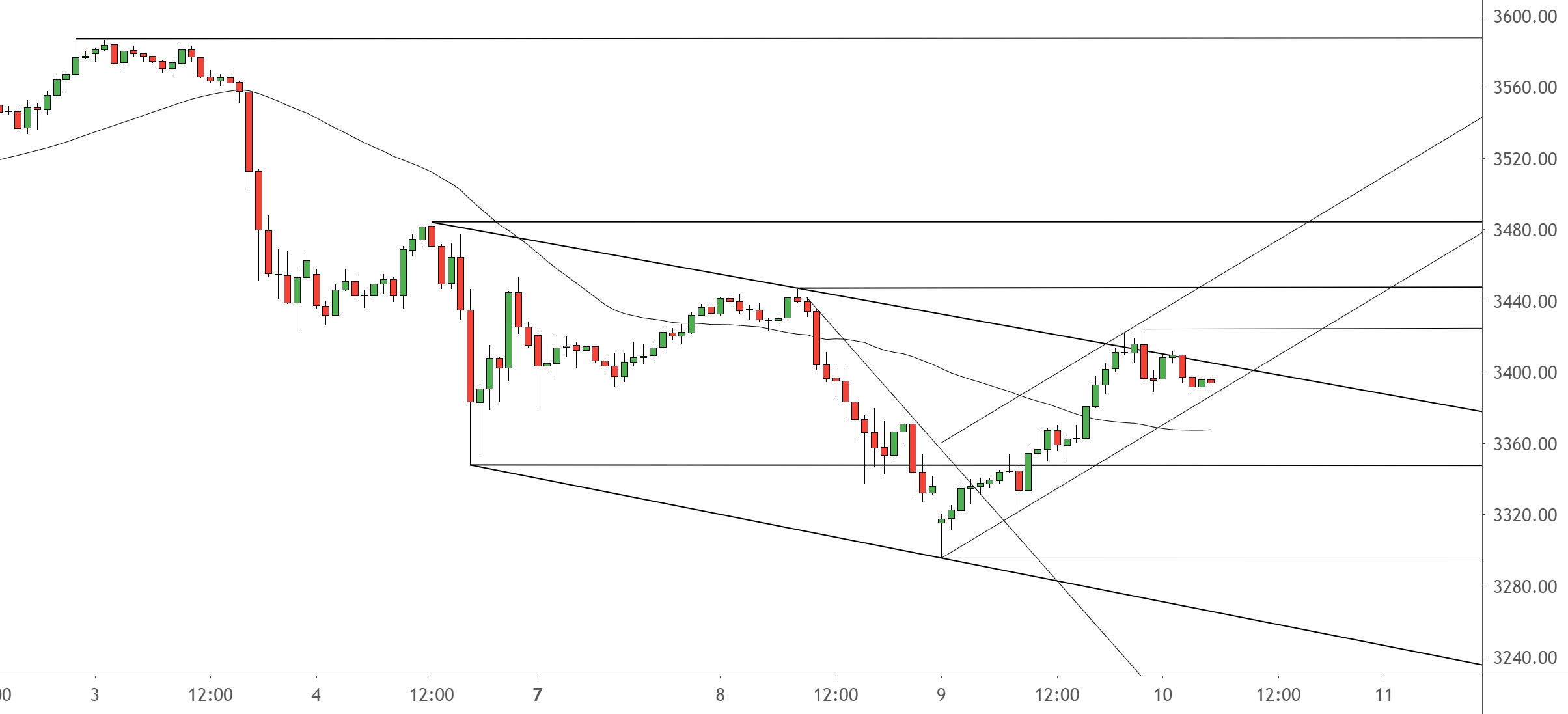 Um seine Erholung fortzusetzen, muss der SPX500 heute mit dem Bruch des skizzierten Abwärtstrends bei um 8:00 Uhr 3.402 mit einem weiteren Kaufsignal nachlegen. Der SPX500 blieb schon die ganz Nacht über beharrlich dran an diesem Trend. Die Chancen für die Bullen sind also gut. Nächste Ziele nach oben sind nach diesem Kaufsignal mindestens ein weiteres Erholungshoch über dem letzten bei 3.424, wobei der nächste Major-Widerstand bei 3.447 aber auch leicht erreichbar ist. Wenn später auch dieser Ausbruch gelingt, verläuft der nächste Widerstand gar erst bei 3.484,5. – Nach unten kommt es als erstes auf den Aufwärtstrend bei um 8:00 Uhr 3.396 an. Sobald er gebrochen wird, ist der Weg leicht frei bis zur nächsten Major-Unterstützung bei 3.347,75, wo sich dann auch wieder antizyklische Chancen auf der Longseite ergeben.