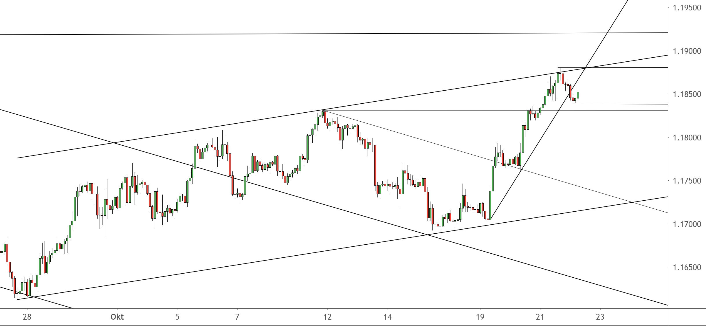 Der EURUSD hat jetzt das prädestinierte Erholungsziel am Aufwärtstrendkanal erreicht. Zu einer Wende aus dem Stand dürfte es aber nicht kommen, auch nach dem Bruch des steilen Aufwärtstrends nicht. Vielmehr dürfte der Euro jetzt in eine Topbildung übergehen. Das bedeutet, dass jeder weitere Kanaltest bei 1,1879-1,1882 und jedes weitere High über 1,18807 ein False-Breakout zu werden droht, verbunden mit entsprechend guten Chancen auf der antizyklischen Shortseite. Sobald sich heute ein zweites Konsolidierungstief unter dem ersten bei 1,18384 nicht durchsetzt, signalisiert das einen nochmaligen Anlauf nach oben. Erst wenn die Major-Unterstützung am Vorgängerhoch bei 1,18312 fällt, entsteht daraus ein erstes prozyklisches Kaufsignal.