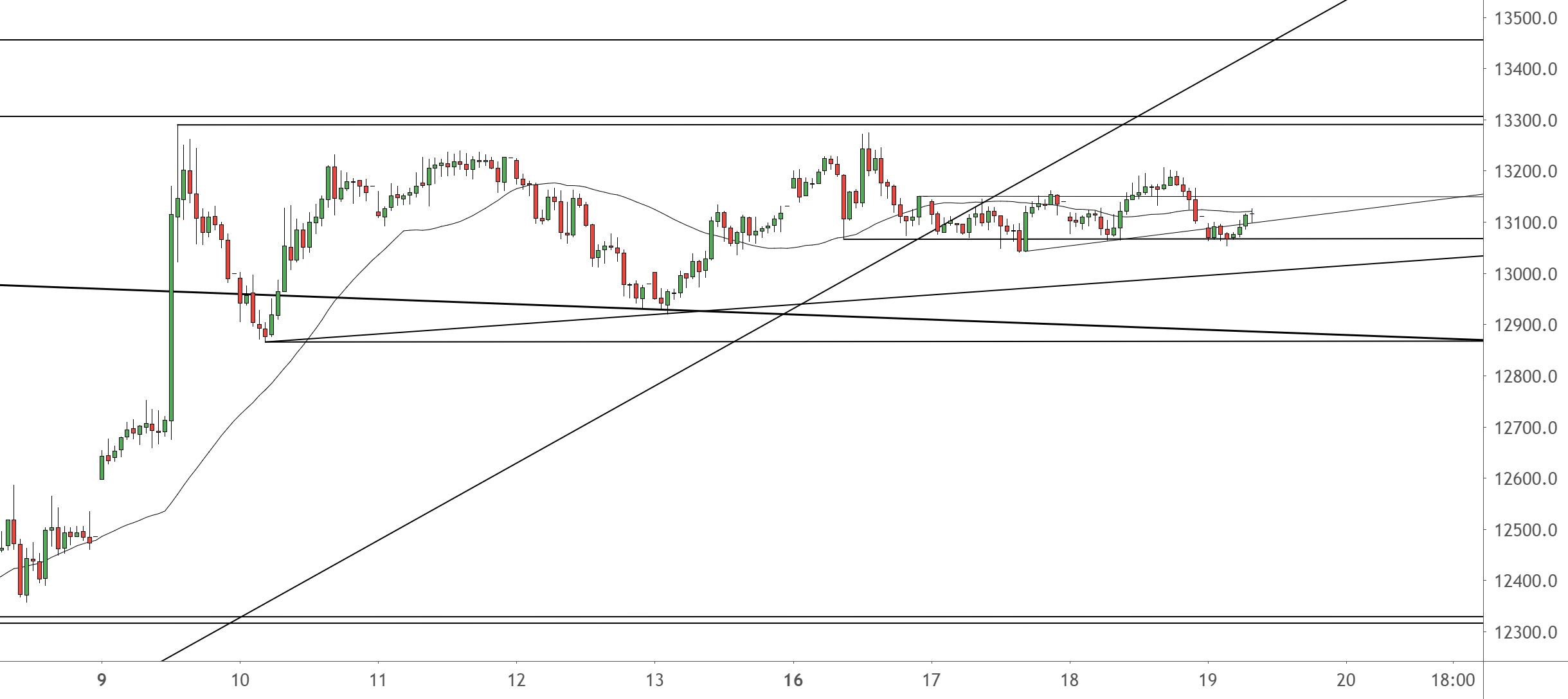 Der GER30 weist seit 2 Tagen keinerlei Tendenz mehr auf. Er hat jetzt Pause. Und auch für heute drängt sich am Morgen noch kein neuer expliziter Richtungsmarkt auf. Es gibt also attraktivere Handelstage für das Trading. – Die enge Trading-Range wird definiert durch die Unterstützung bei 13.066 und den Widerstand bei 13.150. Heute Morgen geht es nach der Rückkehr über den flachen kurzfristigen Aufwärtstrend zunächst wieder in Richtung 13.150. Doch erst darüber geht mehr. Darüber ist der Weg wieder auf bis zum Major-Widerstand an der oberen Formationsbegrenzung bei 13.290,5. – Nach unten erfolgt ein erstes Shortsignal mit einem Ausbruch unter die Betonunterstützung bei 13.066. Doch auch darunter wird das Abwärtspotential von der relativ nahen nächsten Auffanglinie an der Schrägen bei 13.004-13.014 zunächst noch begrenzt. Erst nach diesem weiteren Verkaufsignal ergibt sich wieder ein größeres Teilstück bis zur Majorzone an der Unterstützung bei 12.865 und dem historischen Trendpullback bei 12.854-12.858 Punkten.