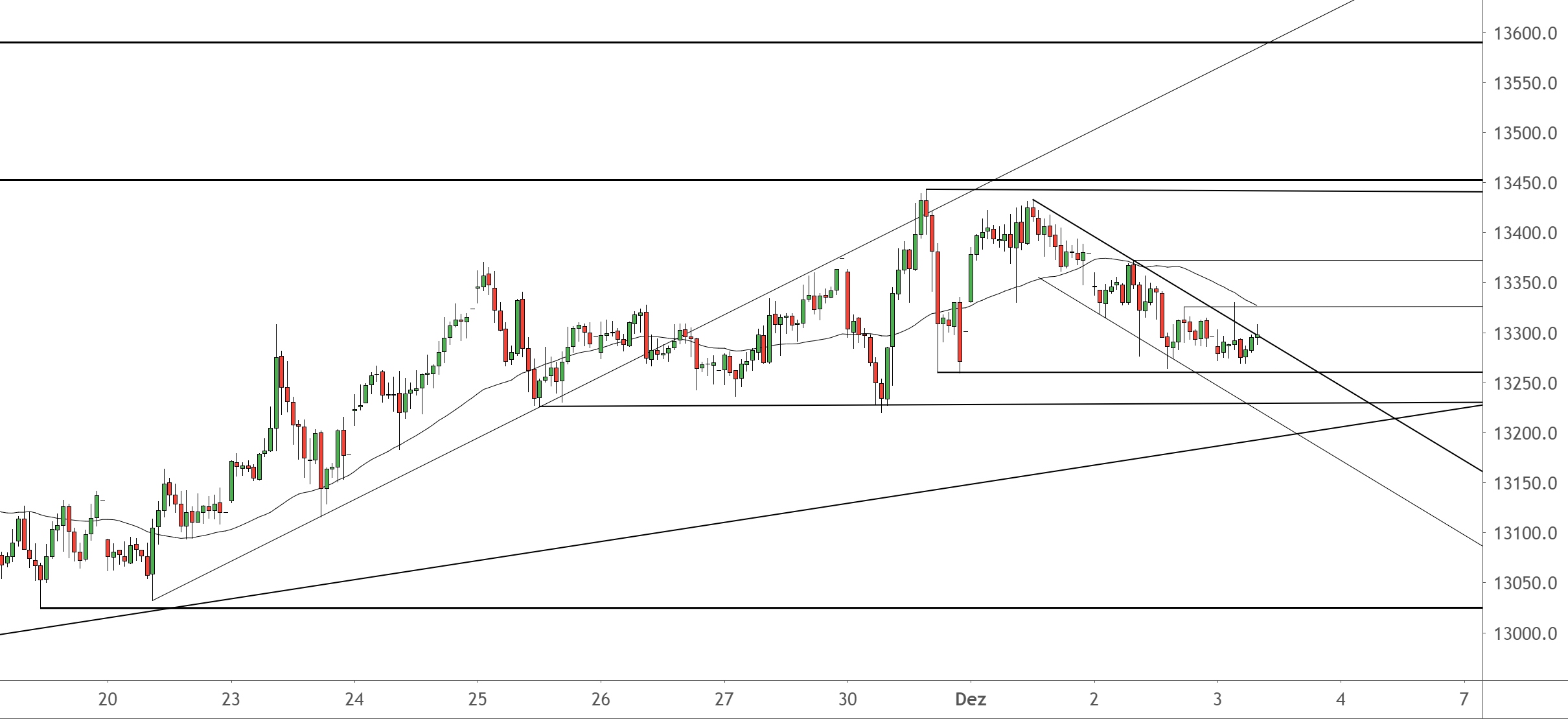 Der GER30 arbeitet heute Morgen auf ein neues Kaufsignal hin. Dieses ergibt sich entweder, wenn der GER30 auf Stundenbasis sicher über seinen Abwärtstrends bei 13.295-13.254 ausbricht. Alternativ führt aber auch ein False-Breakout und Reversal an der nächsten Major-Unterstützung bei 13.260 auf die Longseite. Auf dem Weg nach oben warten bei 13.325,5 und 13.372 zwei Widerstände, die erst einmal abgearbeitet werden müssen. Grundsätzlich ist der Weg nach ganz oben aber wieder relativ leicht auf. Erst nach einem neuen High über 13.443/54 sollte verstärkt auch auf ein impulsives False-Breakout und Reversal als Shortsignal gelauert werden. – Die Chancen auf der Longseite liegen für heute also auf der Hand. Klappt das dennoch nicht, ergeben sich hochwertige Verkaufsignale und ein bearisher Setupwechsel erst mit einem Ausbruch unter die Major-Unterstützung bei 13.226 und den Aufwärtstrend knapp darunter bei 13.193-13.204 Punkten.