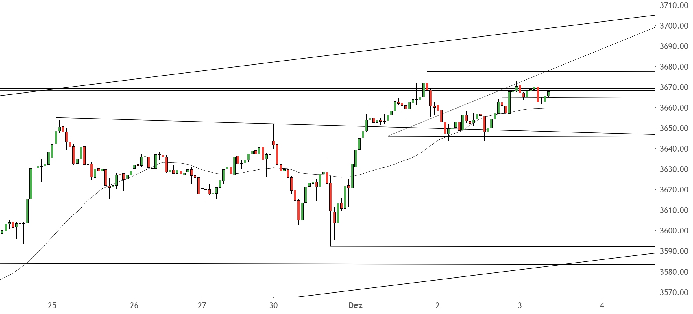 Der SPX500 konsolidiert seit 2 Tagen auf hohem Niveau seitwärts. Eine Auflösung auf neue Highs über 3.677,5 ist dabei wahrscheinlich. Neue klassische Kaufsignale gibt es auf dem bereits hohen Niveau dafür aber nicht mehr. Ein Ausbruch über die Majorzone bei 3.668/69 ist dazu wegen des zu überschaubaren Potentials nur noch bedingt tauglich. Nach oben ist der Weg bis zum Trendkanal bei 3.699-3.702 leider nicht leicht auf, da vorher das bereits bewährte obere Trendpullback bei 3.678-3.87 im Weg steht. Deshalb sollte nach einem neuen Hoch über 3.677,5 vor allem auch auf ein oberes False-Breakout und Reversal geachtet werden. Da kann sich schnell lohnen. Denn im Anschluss ist der Weg nach unten schnell und leicht wieder auf bis zur Majorzone am Trendpullback bei 3.648-3.647,5 und an der Unterstützung bei 3.646. Auch an dieser unteren Zone sollte bei Erreichen ähnlich wie gestern erneut auf ein False-Breakout und Reversal als Entysignal für die Longseite gelauert werden.