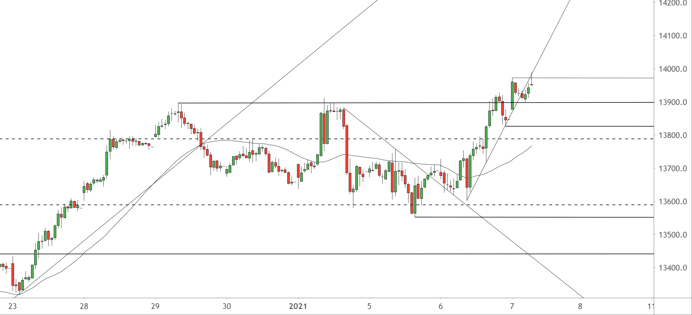 Beim GER30 steuert die Horizontale bei 13.896 heute das Setup