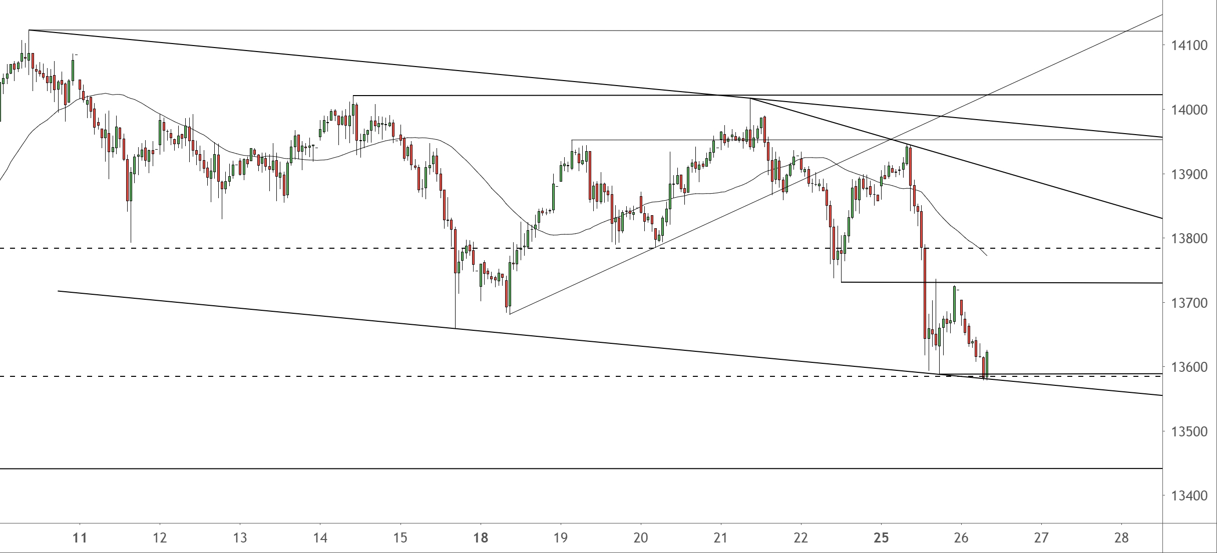 Der GER30 startet heute mit einem Longsignal in den europäischen Handelstag. Am Abwärtstrendkanal bei 13.581-13.574 und am gestrigen Low bei 13.588 kam es soeben zu einem False-Breakout und Reversal. Und dieses Reversal ist nun gut ausbaufähig. der nächste Major-Widerstand wartet erst am Vorgängertief und an den gestrigen Erholungshochs bei 13.731 Punkten. Damit ist die heutige Trading-Range erst einmal klar definiert und eingerahmt. Die besten Chancen lauern an den Außen, so wie soeben schon. – Ein nachhaltiger Ausbruch unter den Abwärtstrendkanal ist heute nicht aufdringlich. Er würde allerdings den Weg aufmachen bis zur nächsten Major-Unterstützung, die erst bei 13.440,5 verläuft. – Auch ein Ausbruch über den Major-Widerstand bei 13.731 drängt sich zumindest im neuerlichen ersten Anlauf noch nicht auf. Doch erst darüber geht mehr. Darüber ist der Weg bis zum ersten Abwärtstrend bei 13.910-13.889 dann aber auch schon auf.