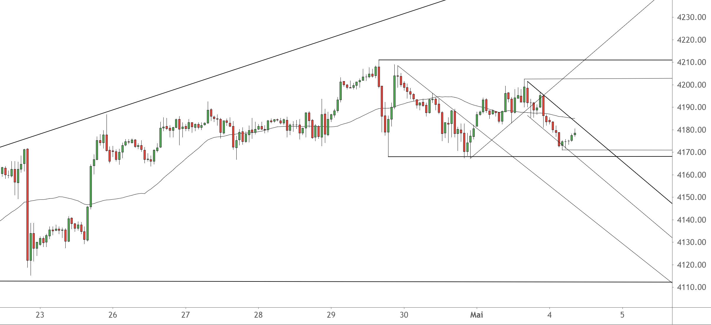 Der SPX500 transportiert seinen Konsolidierungsmodus zunächst weiter in den Monat Mai. Eine schnelle Änderung zeichnet sich auch heute noch nicht ab. Es bleibt bei der übergeordneten horizontalen Konsolidierungsrange von 4.168 zu 4.211 Punkten. – An der Unterseite geht erst dann noch einmal mehr in Richtung der Major-Unterstützung bei 4.113, wenn der SPX500 unter die Major-Unterstützung bei 4.168 ausbricht. Doch danach sieht es heute auch in dem neuen Anlauf noch nicht aus. Wahrscheinlicher ist ein False-Breakout am letzten Zwischentief bei 4.171 als früher und tiefer Longtrigger. Ein prozyklisches Kaufsignal entsteht mit dem Bruch des Abwärtstrends bei 4.182-4.168. Auf eine zeitnah bevorstehende Auflösung der Seitwärtskonsolidierung nach ganz oben lässt dieses Kaufsignal alleine zwar noch nicht schließen. Doch bis zum gestrigen Tageshoch bei 4.202,5 hat der SPX500 andererseits freie Bahn. Achten Sie dort dann aber auch wieder auf ein oberes False-Breakout als Umkehrsignal.