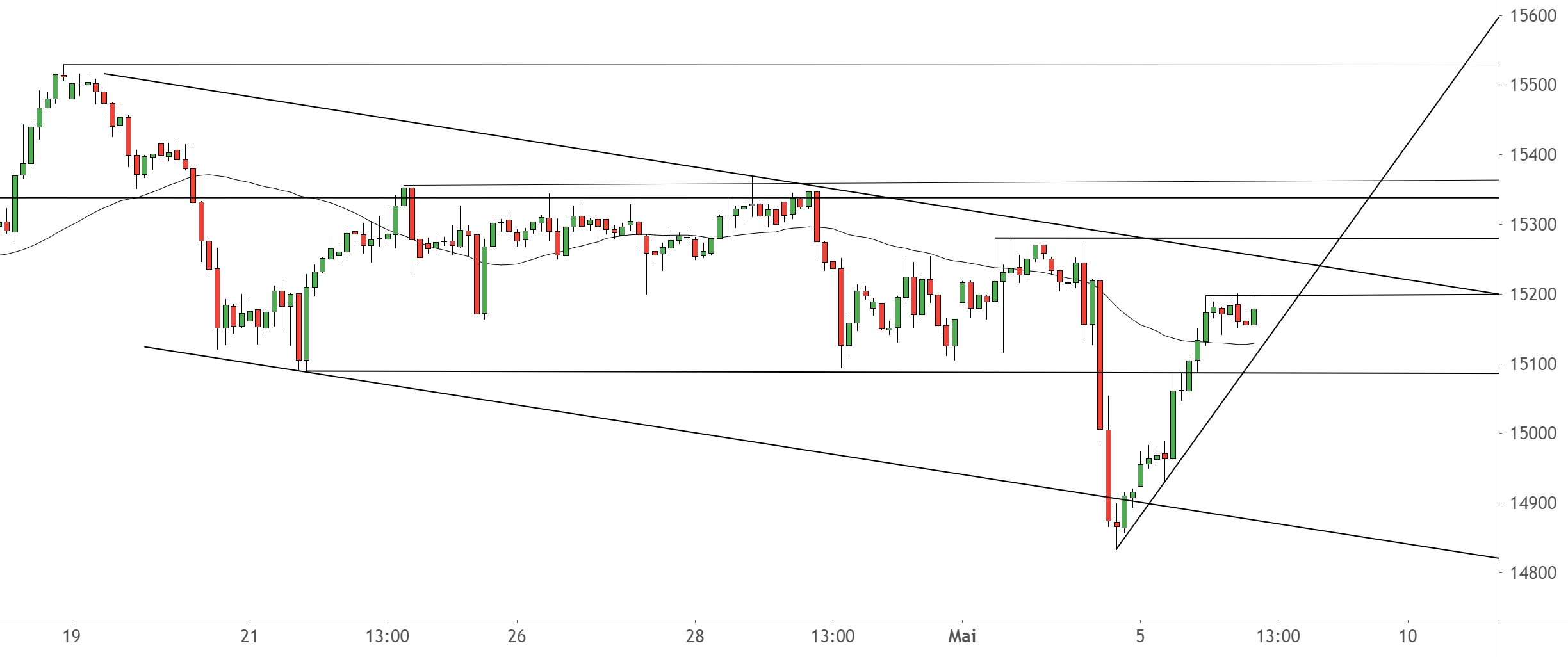 Nach dem scharfen unteren Reversal und der starken Erholungsrallye wird es für den GER30 heute nach oben erst einmal nicht mehr leichter. Es warten jetzt eine ganze Menge Widerstände. Die multiple Zone beginnt am Hauptabwärtstrend bei 15.255-15.243, dann folgen die Widerstände bei 15.280, 15.338 und 15.355. Nach oben dürfte es also eher mühsam werden. Erst mit Überwinden der gesamten Zone wird es wieder leichter. Dann rufen auch wieder neue Highs über 15.529. – Verkaufsignale gibt es heute auf der anderen Seite, sobald sich ein Ausbruch über das bisherige Erholungshoch bei 15.197 via False-Breakout nicht durchsetzen kann und zudem der kurzfristige Aufwärtstrend bei 15.125-15.220 gebrochen wird. Nächstes Ziel an der Unterseite ist dann wieder die Unterstützung am ersten Korrekturtief bei 15.089, dort aber auch wieder mit antizyklischen Chancen auf der Longseite. Erst darunter geht noch einmal richtig mehr nach unten.