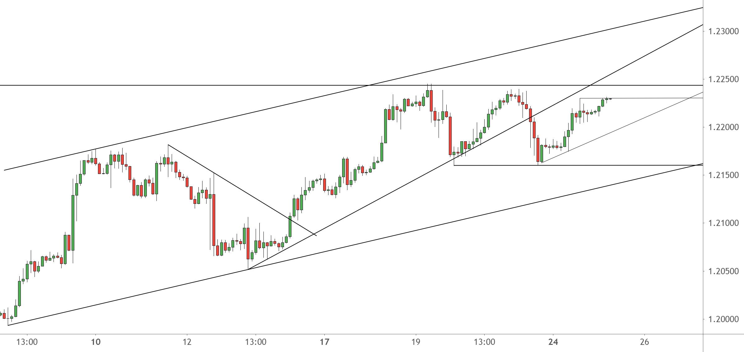 Der EURUSD hat in den letzten Tagen auf hohem Niveau und unterhalb des Major-Widerstandes bei 1,2244 USD trendbestätigend bullish seitwärts konsolidiert. Ein bevorstehender Ausbruch über 1,2244 USD ist daher wahrscheinlich. Das weitere Aufwärtspotential wird derzeit allerdings recht deutlich vom Pullback an den letzten Aufwärtstrend begrenzt, das heute bei 1,2257-1,2270 USD verläuft. Ein Durchmarsch bis zum Aufwärtstrendkanal bei 1,2303-1,2309 USD drängt sich daher nicht auf. – Erste Chancen auf der Shortseite gibt es, sobald es am gestrigen Hoch bei 1,2230 USD oder später bei 1,2244 USD zu auffälligen False-Breakouts und Reversals kommt. Die mit Abstand stärkste Major-Unterstützung bilden auch weiterhin die letzten Konsolidierungstiefs bei 1,2160 USD. Zur Etablierung eines Setupwechsels bedarf es zusätzlich eines Bruchs des mehrtägigen Aufwärtstrends bei heute 1,2140-1,2146 USD, was aber so schnell noch nicht zu erwarten steht.