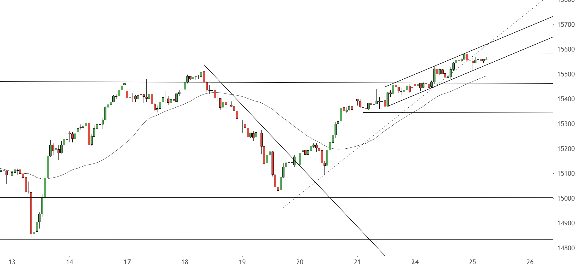 Der GER30 ist gestern aus seiner mehrwöchigen Konsolidierungsrange nach oben ausgebrochen. Jetzt ist echte Ausbruchsdynamik gefragt. Doch die charttechnischen Möglichkeiten dazu bleiben zunächst erst einmal deutlich begrenzt. Dafür steht der sehr signifikante verflachte Aufwärtstrendkanal, dessen obere Kanallinie heute bei überschaubaren 15.623-15.684 verläuft. Das ist allerdings leicht machbar, auch mit mehreren Anläufen. Mit mehr sollten Sie jedoch allenfalls oberhalb des Kanals planen. – Für die Shortseite sollte als Verkaufsignal unbedingt ein Bruch des verflachten Aufwärtstrends bei heute 15.542-15.602 abgewartet werden. Verzichten Sie vorher besser auf Antizyklik. Nach diesem Trendbruch-Verkaufsignal bilden die beiden Major-Horizontalen und oberen Ausbruchslinien bei 15.529 und dann vor allem auch bei 15.472 die ersten Korrekturziele. Unter 15.472 kommt es zu einem nachhaltigeren bearishen Setupwechsel, was den Abgabedruck erhöhen kann. Die nächste Auffanglinie verläuft dann an der Verflachungsbasis bei 15.347 Punkten.