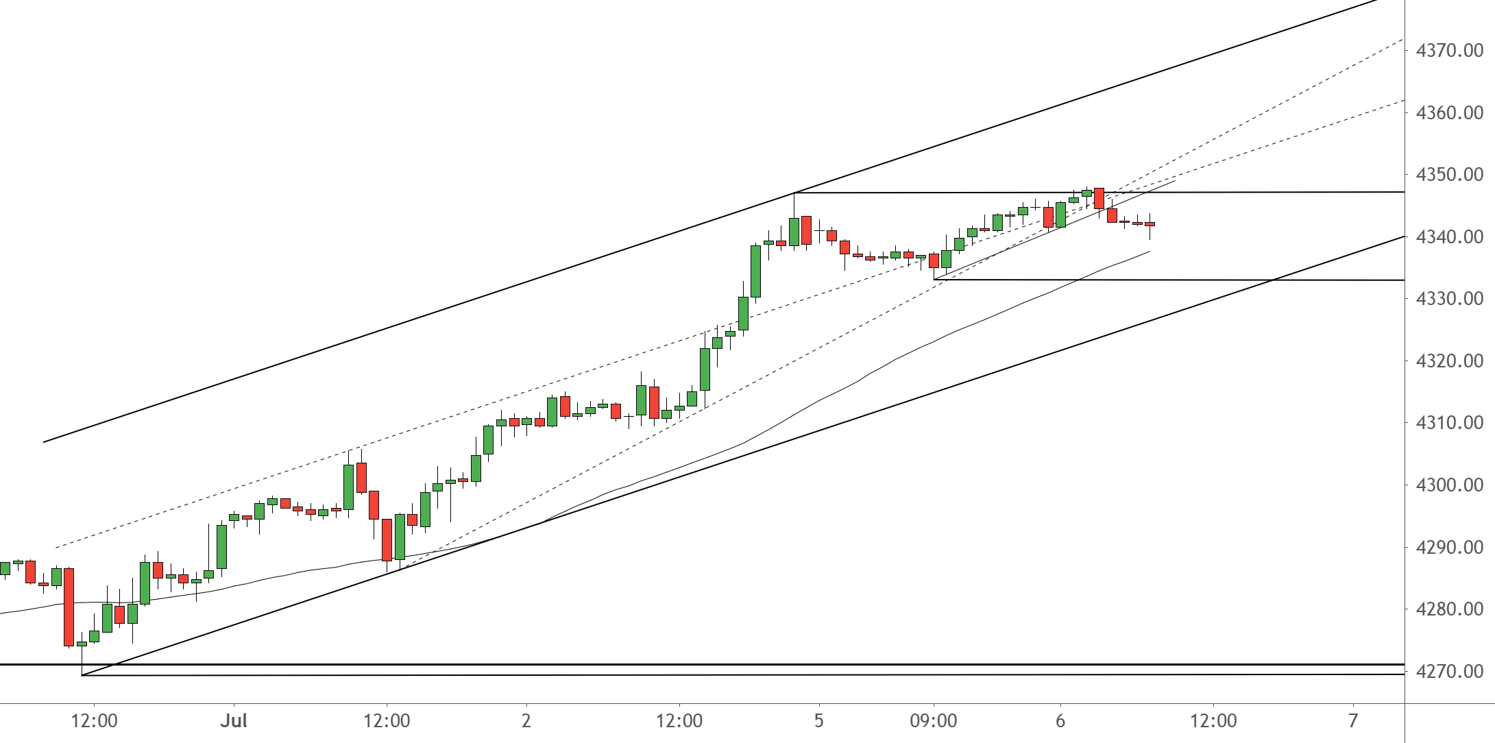 Nach der jüngsten Superrallye ist der SPX500 seit gestern in eine Seitwärtskonsolidierung übergegangen. Diese dürfte zunächst auch heute weiter anhalten. Die Konsolidierungsrange verläuft in dem Rechteck von 4.333 zu 4.347 Punkten. Insbesondere nach einem False-Breakout an der unteren Formationsbegrenzung ergeben sich neue antizyklische Chancen auf der Longseite. Nach einem vorzeitigen Ausbruch über den Widerstand bei 4.347 zählt es wieder prozyklisch. Allerdings wird der Weg nach oben heute wegen der beiden gestrichelten Pullbackthemen nicht gerade einfach werden. Sobald es daher bei 4.347 im Tagesverlauf zu einem auffälligen False-Breakout kommt, startet damit auch eine neue Korrektursequenz. Zielthema ist dann Stand jetzt wieder die Unterstützung bei 4.333. Perspektivische Verkaufsignale ergeben sich heute erst nur mit einem Ausbruch unter die Unterstützung bei 4.333 und einem gleichzeitigen Bruch des Aufwärtstrends bei 4.327-4.336. Das ist nicht absehbar, aber in diesem Fall gibt es viel leichtes Potential nach unten.