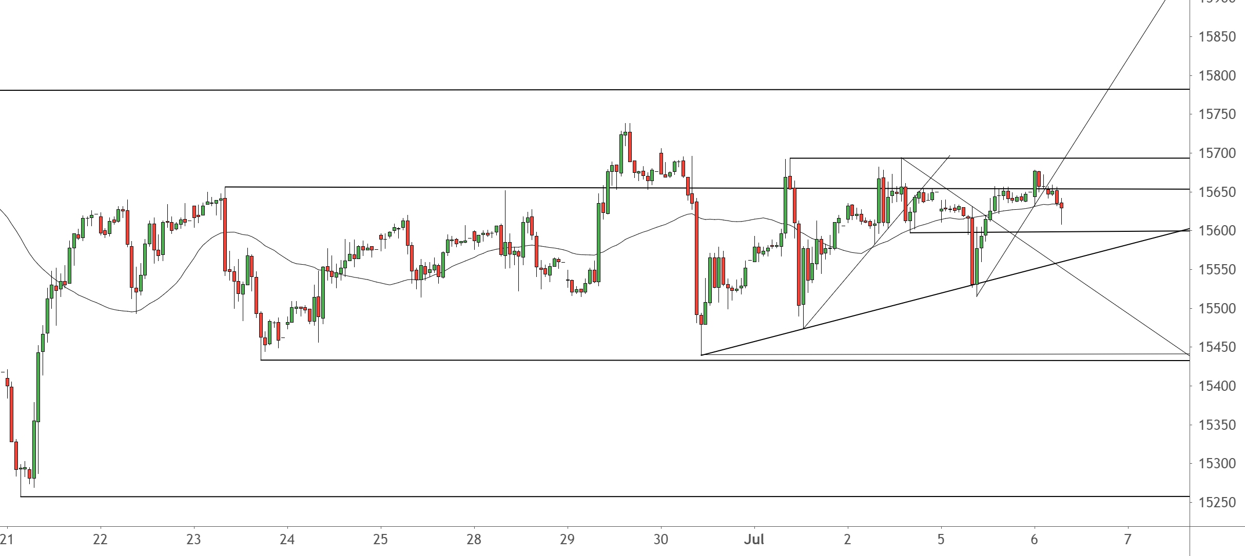 Es nervt inzwischen gewaltig, aber der GER30 findet noch immer nicht aus seinem Seitwärtsmarkt heraus. Immerhin hat sich jetzt einmal das skizzierte ansteigende Dreieck als maßgebliche Formation herauskristallisiert. Die untere Begrenzung verläuft heute bei 15.561-15.580, die obere horizontal bei 15.693. Auf diesen Ausbruch kommt es jetzt als nächstes Richtungssignal an. Solange der GER30 aber weiter in diesem Dreieck verharrt, besteht hingegen immer noch weniger Handlungsbedarf. Schon sobald der GER 30 über den Widerstand bei 15.656 ausbricht, greift er wieder nach ganz oben an. Einem unterem Ausbruch steht zunächst auch noch die Unterstützung bei 15.597 im Weg. – Zu den Ausbruchsperspektiven: Bei einem unteren Ausbruch verläuft die nächste Major-Zone als prädestiniertes Zielthema weiterhin bei 15.433/40. Nach einem oberen Ausbruch sollte das spätere Ziel deutlich jenseits des Allzeithochs bei 15.780 Punkten zu suchen sein. Je mehr Spannung das Dreieck jetzt aufbaut, desto mehr Move sollte es nach dem Ausbruch geben.