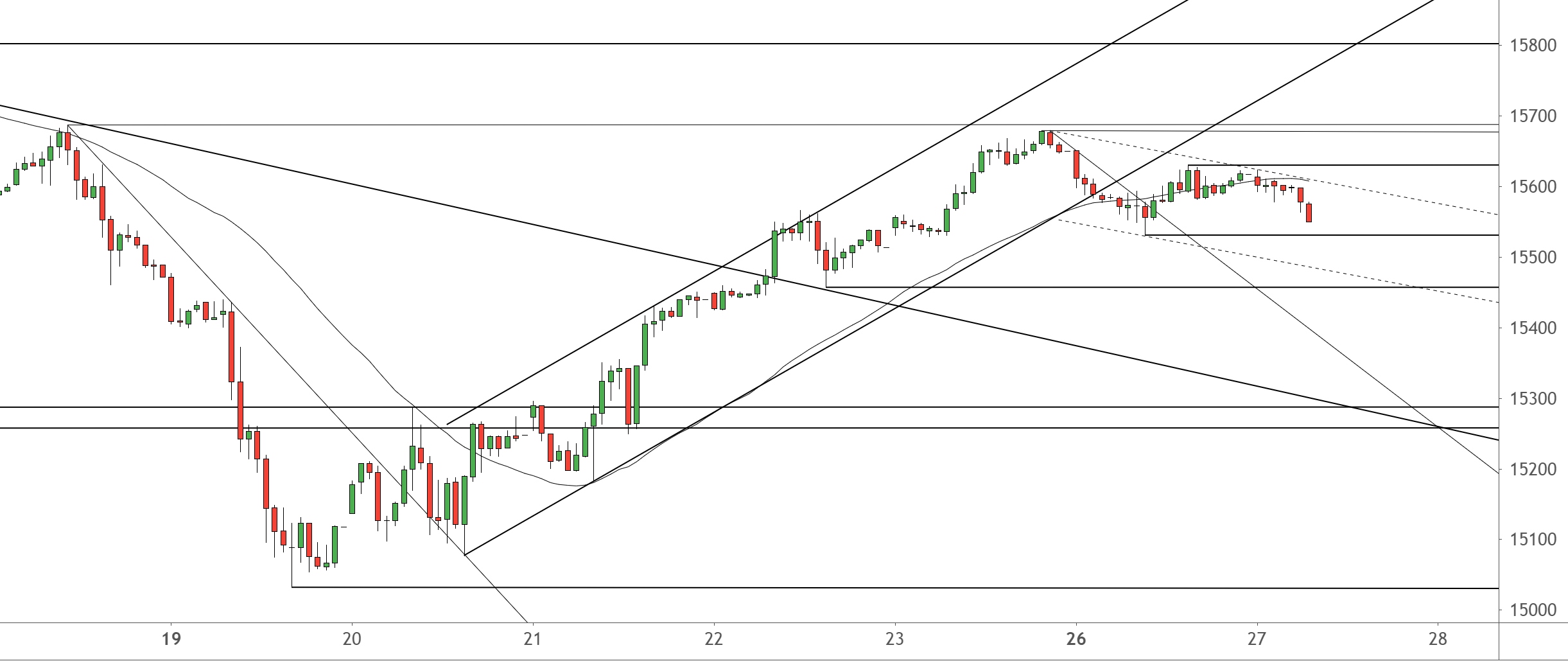 Der GER30 startet nach dem gestrigen Trendbruch-Verkaufsignal auch heute Morgen erst einmal weiter im Konsolidierungsmodus. Dabei nimmt er Kurs auf ein zweites Korrekturtief unter 15.531, um damit eine klassische A-B-C-Struktur zu vollenden. Das weitere Korrekturpotential sollte allerdings auf die nächste Unterstützung bei 15.457 begrenzt bleiben. Dafür spricht auch der gestrichelt angedachte neue Abwärtstrendkanal, der zur Stunde knapp darüber verläuft. Die weiteren Chancen auf der Shortseite dürften also überschaubar bleiben. – Deutlich bullisher sieht es hingegen ab sofort, sobald sich ein zweites Korrekturtief unter 15.531 nicht mehr durchsetzen kann. Ein False-Breakout und Reversal dort wird ein erstes Kaufsignal bringen. Für das zweite Kaufsignal steht später ein Ausbruch über den gestrichelten Abwärtstrend bei 15.608-15.581, der allerdings erst nach einem neuen Low gültig wird. Übergeordnet sollte der GER30 die Konsolidierung mit einem Ausbruch über die Widerstandszone bei 15.679/15.687 beenden. Ziel bleibt daher ein möglichst günstiger Einstieg auf der Longseite.