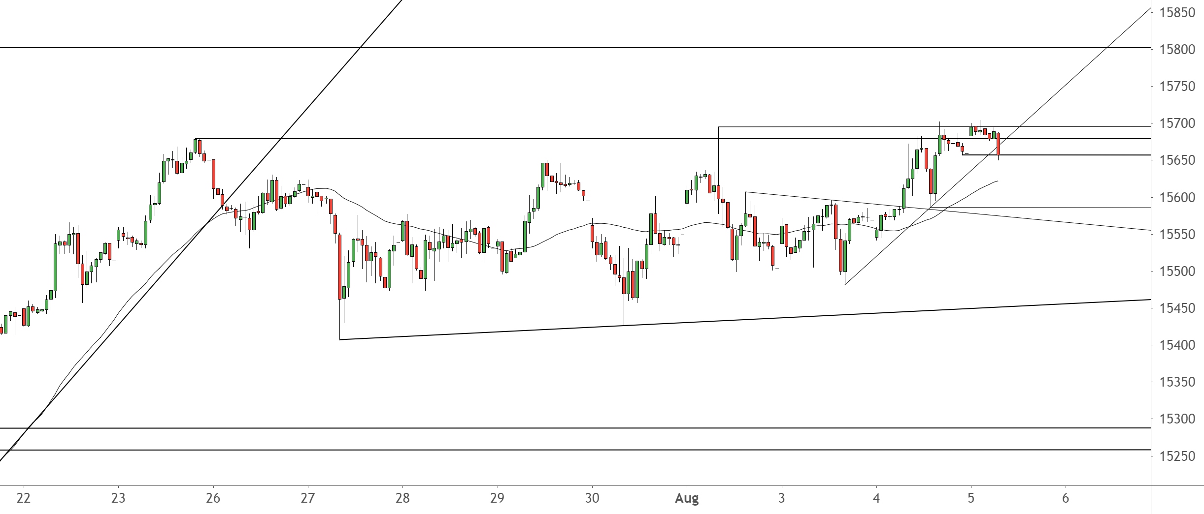 Der GER30 hat es bis heute Nacht trotz mehrfacher Anläufe nicht geschafft, die Seitwärtskonsolidierung zu beenden und über die Widerstände bei 15.679 und 15.695 auszubrechen. Heute Morgen sieht es nun erst einmal wieder nach Verkaufsignalen und damit einem Rückfall in die Weiten der Konsolidierungsrange aus. Das erste Verkaufsignal brachte bereits der Bruch des kurzfristigen Aufwärtstrends. Bestätigt wird es von einem Ausbruch unter die aktuelle Unterstützung bei 15.657. Darunter gibt es leichten Spielraum für eine neue Abwärtsamplitude. Die nächsten Unterstützungen belaufen dann erst wieder bei 15.586 und am Pullback an die Schräge bei 15.574-15.567. Hält später auch diese Zone nicht, verläuft die untere Formationsbegrenzung als Majorthema bei 15.450-15.455. – Ein Shortsetup ist heute für die erste Phase des Handelstages also bereits nahe. Zu einem Longsetup führt aktuell nur noch ein handfester Ausbruch über die hartnäckige obere Ausbuchszone bei 15.679 und 15.695. Dann ist der Weg bis zum Allzeithoch bei 15.802 allerdings auch leicht auf.
