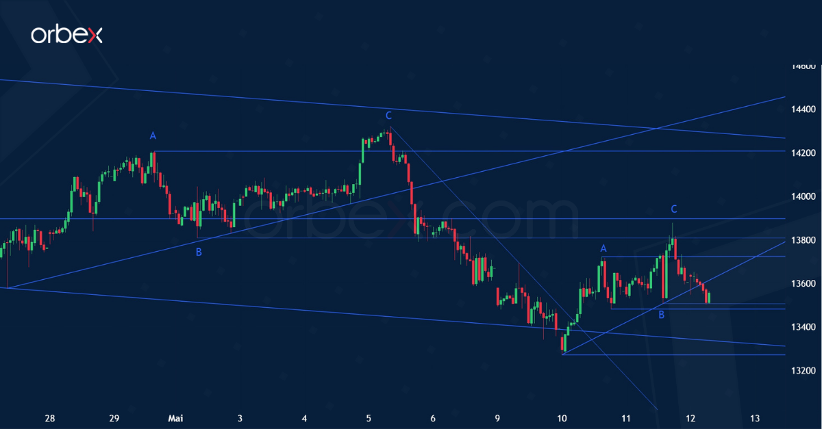Der GER40 absolvierte nach dem großen Erholungs-A-B-C in der Vorwoche in den letzten beiden Handelstagen nun ein kleineres. Die Botschaft ist identisch bearish, und die beiden Verkaufsignale stehen auch schon wieder. Auf dem Weg nach unten gibt es nun an den Zwischentiefs-B bei 13.482 und 13.507 noch eine letzte stärkere Unterstützungszone. Diese hält zur Stunde auch. Die Erholungschancen von hier aus sind jedoch begrenzt. Zunächst versperrt das Pullback an den Aufwärtstrend bei 13.616-13.708 den Rückweg nach oben. Und zu einem bullishen Setupwechsel führt ohnehin erst ein erneuter Ausbruch über das Hoch-A bei 13.722. Beide Pullbackthemen stehen aber zuvorderst für noch einmal gute antizyklische Chancen auf der Shortseite. – Sobald der Ausbruch unter die besagte Unterstützungszone erfolgt, ergeben sich daraus weitere ordentliche Abwärtspotentiale. Das nächste Major-Thema findet sich dann erst wieder am Abwärtstrendkanal seit Anfang April bei heute 13.339-13.325. Doch auch ganz neue Lows unter 13.272 sind möglich. Erst ein False-Breakout und Reversal an diesen unteren Majorthemen kann später wieder eine Erholung mit guten Perspektiven einleiten.