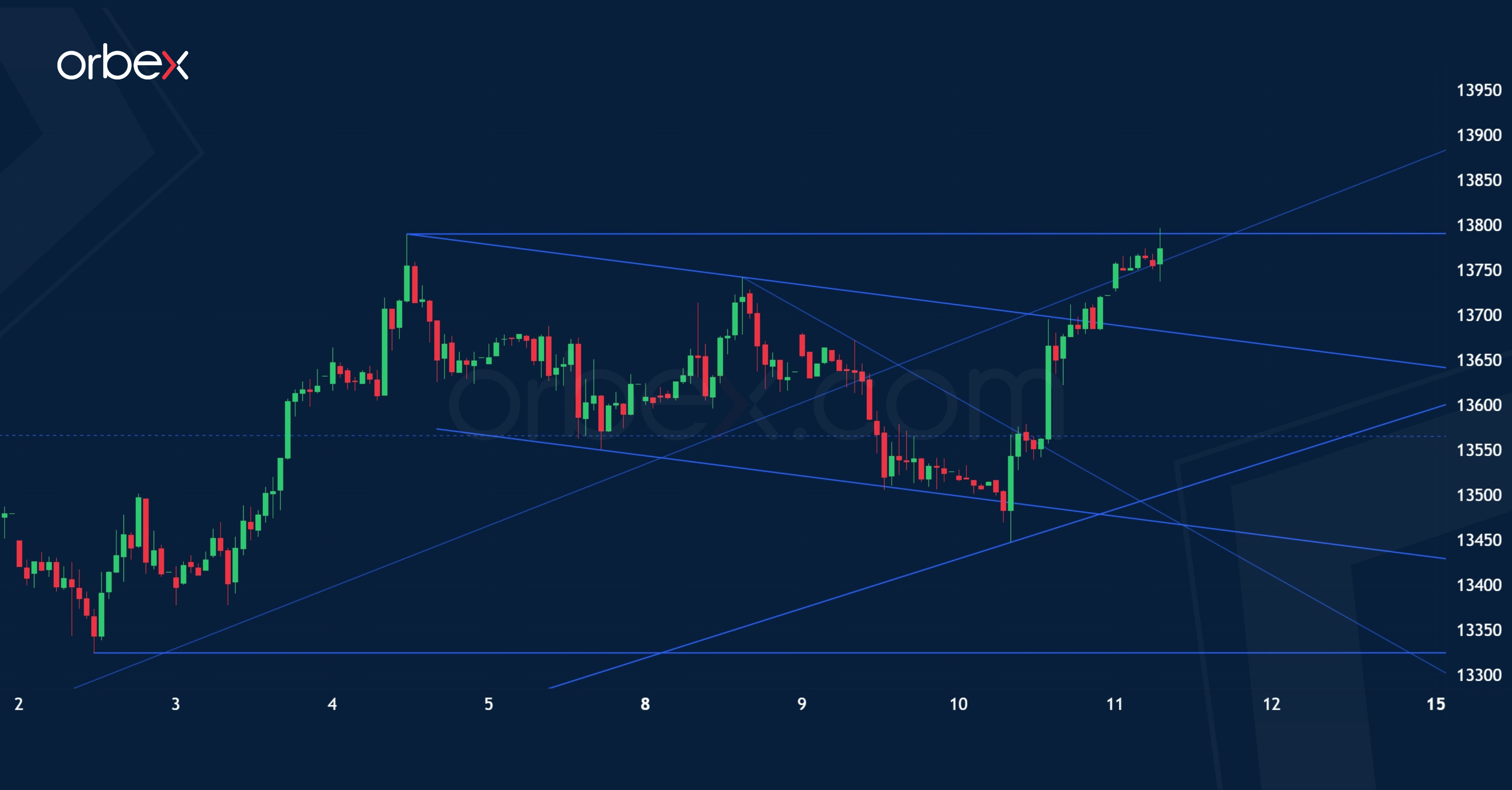 Beim SPX500 führten die schwächer als erwartenden Inflationszahlen gestern zu einer regelrechten Explosion. Von dieser profitiert das trendfolgend bullishe Setup immer noch, und noch ist die Rallye auch mangels Widerständen ausbaufähig. Gute Kaufkurse sind das jetzt aber beinahe selbstredend nicht mehr. – Erste Verkaufsignale entstehen, wenn sich zum ersten Mal ein neues High nicht mehr durchsetzen kann und gleichzeitig der kurzfristige Aufwärtstrend gebrochen wird. Eher früher als später am Tag wird das der Fall sein. Das aktuelle Vorgängerhoch verläuft bei 4.212, bald könnte es aber auch das Hoch bei 4.242,75 werden. Mit einem Rückfall unter das historische Junihoch bei 4.204,75 und unter den Aufwärtstrendkanal verstärkt sich das Korrektursetup zwar noch einmal. Dennoch bleibt das Rückschlagpotential in diesem Dynamikstadium naturgemäß noch überschaubar. Die wichtigste Unterstützung verläuft am markanten Montagshoch bei 4.188. Dort gibt es auch entsprechend gute antizyklische Chancen. Ein Ausbruch unter 4.188 führt dagegen zu einem übergeordnet bearishen Setupwechsel.