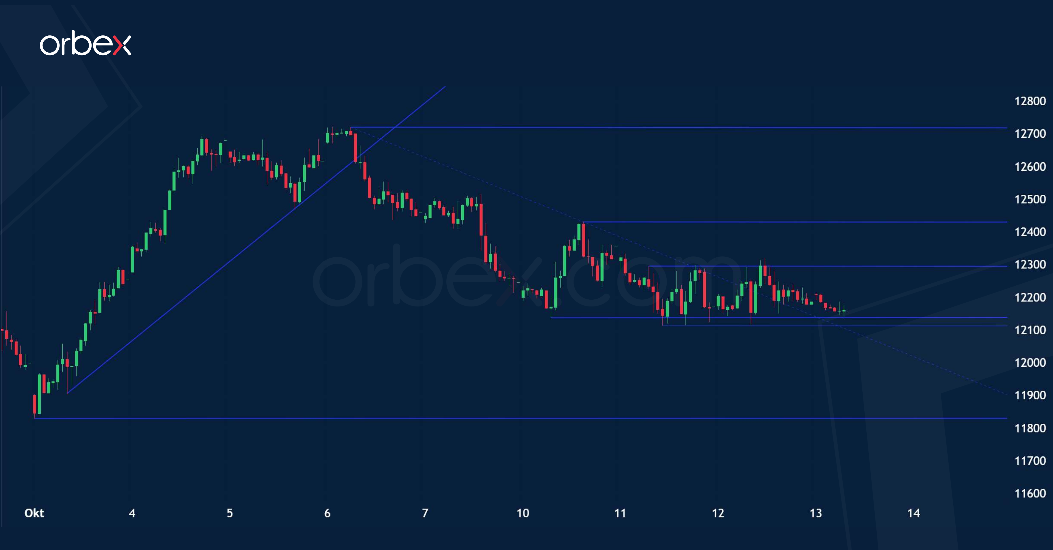 Auch der GER40 startet heute weiter im Wartemodus auf die US-Inflationszahlen. Die horizontale Konsolidierungsrange der letzten beiden Handelstage zwischen 12.113/137 und 12.295 gilt bis zum Beweis des Gegenteils als trendbestätigend bearish. Ein Ausbruch nach unten ist wahrscheinlicher und leichter als nach oben. Erfolgt ein Ausbruchsversuch schon vor 14:30 Uhr, ist er noch nicht endverbindlich. Innerhalb der Range besteht am Vormittag kein wirklicher Handlungsbedarf. Doch wenn, dann heute Morgen eher antizyklisch long an der Zone, aber zunächst ohne die ganz großen Perspektiven. – Kommt es am Nachmittag zu einem dynamischen unteren Ausbruch, geht der Weg damit sofort auf bis auf neue Jahrestiefs unter 11.862. Dann ist die bearishe Chance also gekommen! – Erfolgt der Ausbruch über 12.295 dagegen nach oben, verläuft der nächste Major-Widerstand erst bei 12.430, der dann auch zügig erreicht werden sollten. – Achten Sie am Nachmittag an den Außen der Range aber auch auf markante False-Breakouts als Handelssignal.