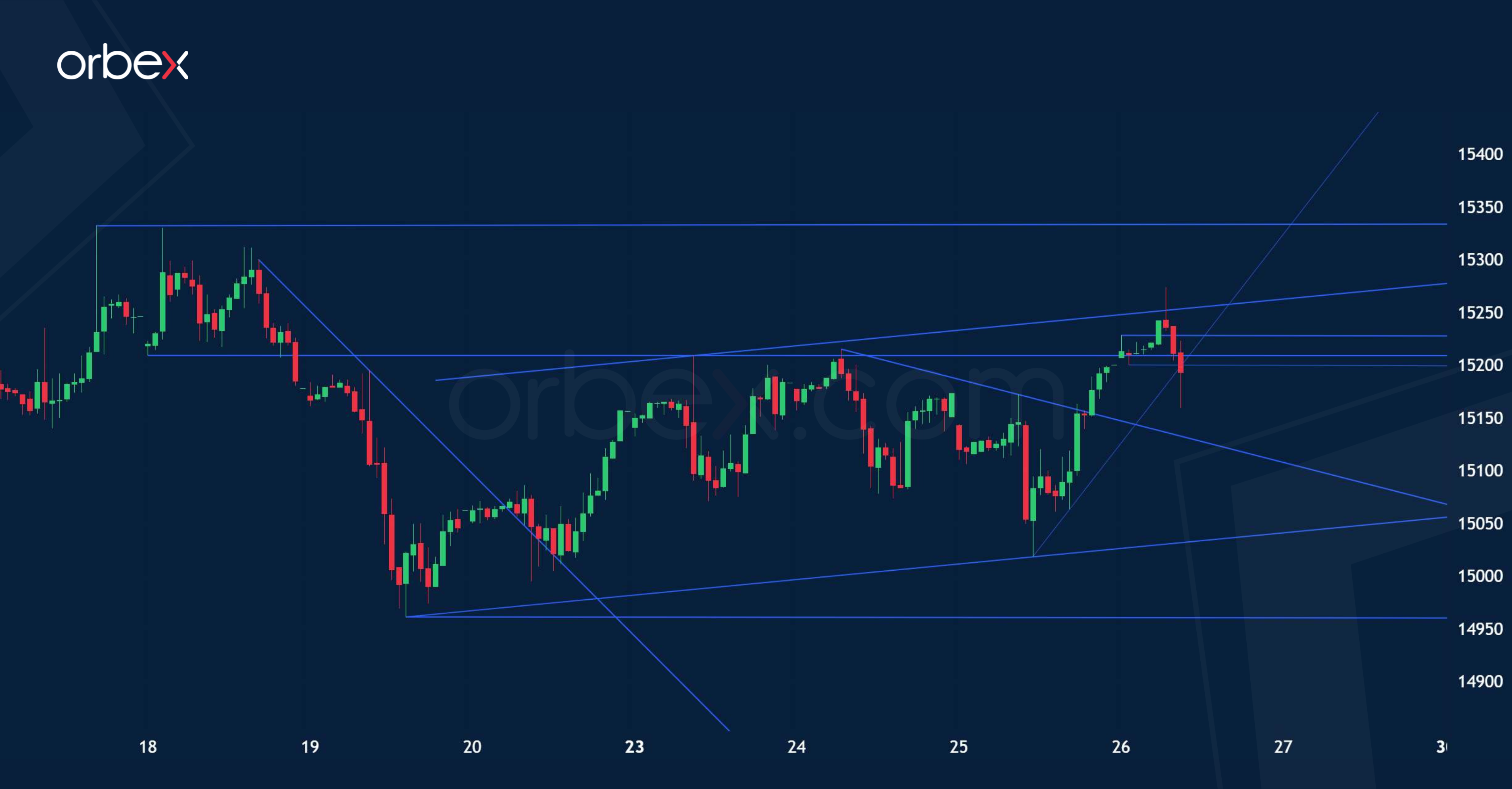 Der GER40 erzielte nach den oberen Fasle-Breakouts zur Eröffnung weitere Verkaufsignale. Das bedeutet aber erst einmal nur, dass der GER40 in seinem übergeordneten Konsolidierungsmarkt verhaftet bleibt, der ja schon die ganze Woche über andauert. Am Pullback an den letzten Abwärtstrend bei 15.133-15.111 gibt es zunächst nur eine einzige, aber auch recht starke Unterstützung, so dass sich dort auch wieder antizyklische Chancen auftun. Erst und nur wenn sich der GER40 darunter absetzt, werden als nächste Ziele auch der flache Aufwärtstrend bei 15.032-15.040 und im nächsten Schritt auch ganz neue Lows unter 14.961 aufgerufen. – Um nach oben wieder in den Angriffsmodus zu kommen und ein erstes Kaufsignal zu erzielen, muss der GER 40 erst einmal wieder über das vorletzte High bei 15.228 ausbrechen. Bis dort bringen erholte Kurse auch noch einmal antizyklischere Chancen auf der Shortseite. Ein Ausbruch über 15.028 ist in diesem Fall aber auch noch nicht der Gamechanger. Denn schon zu bald wartet am Aufwärtstrendkanal bei 15.254-15.262 das noch bedeutendere und vor allem auch schwerere Ausbruchsthema.