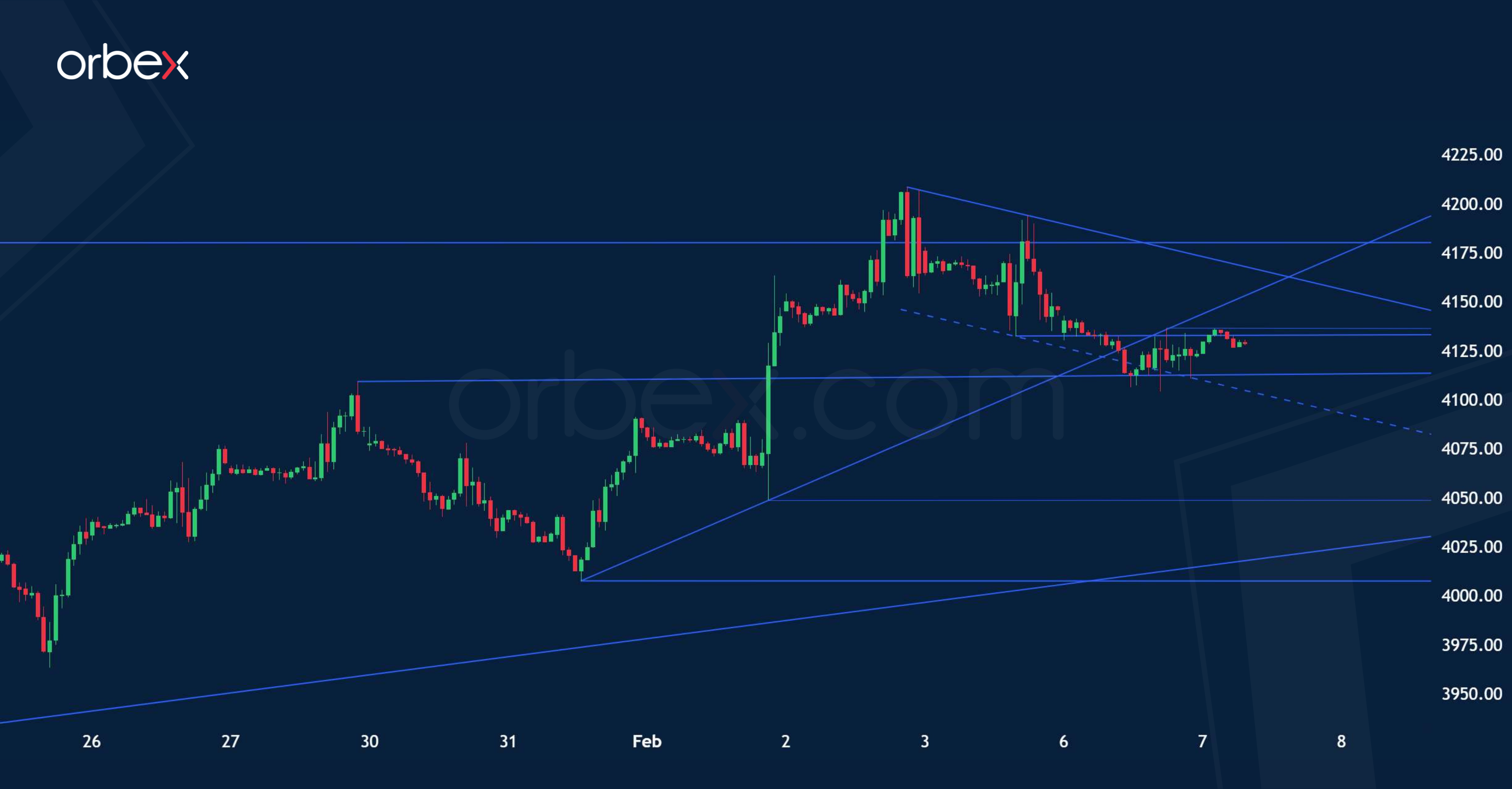Der S&P500 hat gestern die ganz wichtige Unterstützung am Vorgängerhoch bei 4.109,25 getestet und zunächst auch sicher gehalten. Diese Unterstützung ist noch wichtiger als sie hier aussieht, denn sie entspricht auch den beiden Hochs aus Q4. Sobald der SPX500 heute insbesondere am Nachmittag dynamisch darunter weggeht, eröffnen sich beträchtliche Abwärtspotentiale und Chancen auf der Shortseite. Daher sollten wir und dann auch nicht mehr auf den Abwärtstrendkanal bei 4.104-4.095 verlassen. Die nächste nennenswerte Unterstützung verläuft erst bei 4.048,5, die nächste richtige Major-Unterstützung gar erst bei 4.007,5. – Die Erholungskultur war schon gestern auffallend und verdächtig dürftig. Und auch heute bleiben die Perspektiven erst einmal begrenzt. Zunächst muss der SPX500 für ein Kaufsignal über die Widerstandszone bei 4.132,5-4.136,5 ausbrechen. Und das ohne False-Breakout, das sofort wieder ein Shortsignal bringen würde. Doch auch nach diesem Ausbruch steht dem Erholungsweg zumindest heute noch mit einiger Macht das Pullback an den Aufwärtstrend bei 4.154-4.172 im Weg. Spätestens dort gibt es daher auch wieder antizyklische Chancen auf der Gegenseite.