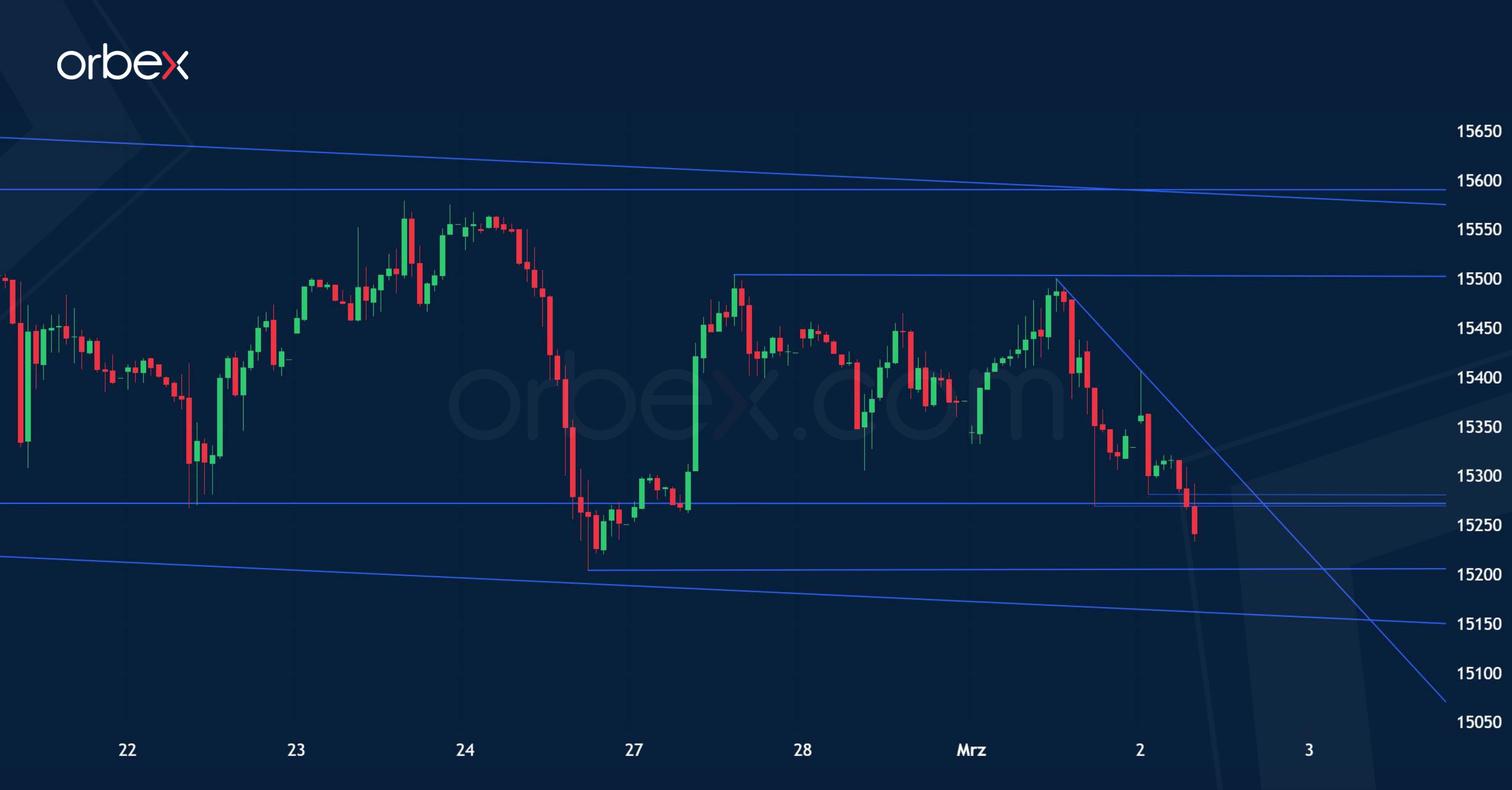 Der GER40 ist vorbörslich unter die ganz wichtige Major-Unterstützung bei 15.272 ausgebrochen. Damit steuert er nun auch zielstrebig auf neue Low unter 15.204 zu. Das weitere leichte Abwärtspotential reicht dann zunächst bis zum großen Konsolidierungskanal bei 15.162-15.158. Und dort geht es dann um alles oder nichts für den GER40. Ein unterer Ausbruch kann zu einer fatalen Druckwelle führen mit allen weiteren Chancen auf der Shortseite. Weitere Unterstützungen gibt es dann nämlich erst einmal keine mehr. – Am Kanal gibt es aber auch antizyklische Chancen. Eine Verbesserung mit erstem Kaufsignal tritt aber auch schon ein, sobald es am Low bei 15.204 nur zu einem auffälligen False-Breakout und Reversal kommt. – Schafft der GER40 schon vor einem neuen Low die Rückkehr über 15.272 und die beiden Vorgängertiefs bei 15.269/81, bedeutet das ebenfalls ein erstes Kaufsignal. Das bestätigende Kaufsignal bringt unabhängig vom Szenario aber erst der kurzfristige Abwärtstrend bei zur Stunde allerdings noch sehr weiten und undankbar weiten 15.340 Punkten.