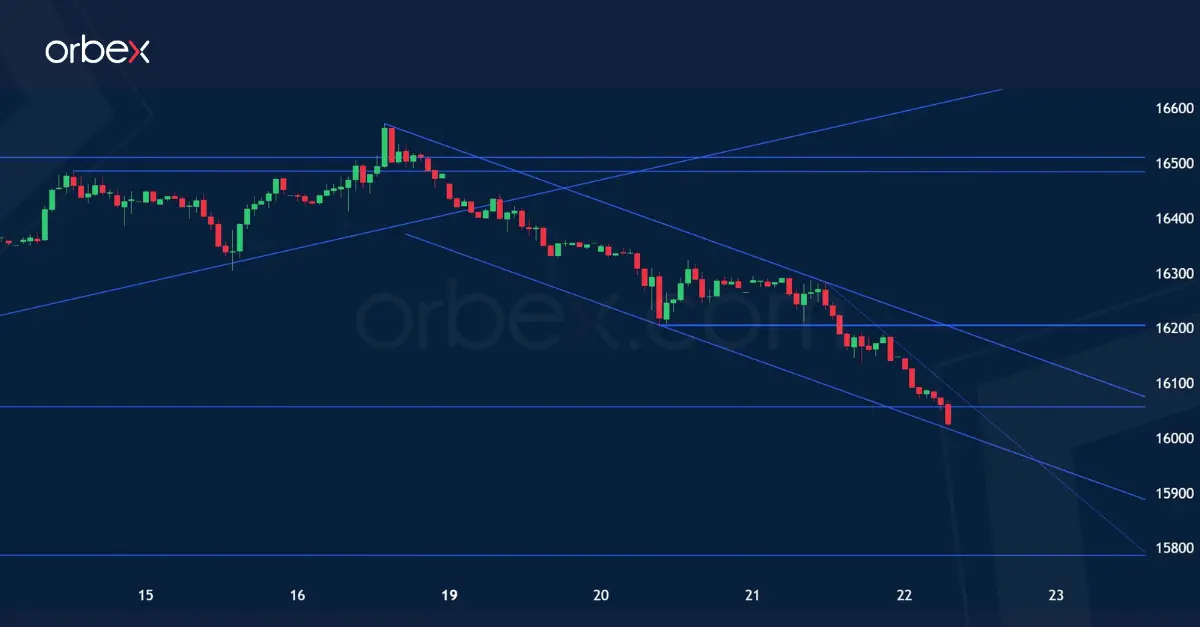 Der GER40 hat gestern seinen längerfristigen Aufwärtstrends seit Oktober 2022 gebrochen, hier gekennzeichnet durch die Horizontale bei 16.205. Seitdem hat er die Druckwelle auch über Nacht ausgebaut. Auch die nächste und zunächst einzige Unterstützung bei 16.057 hat nicht gehalten. Und so steht der GER 40 heute Morgen nun auch schon an seinem Abwärtstrendkanal bei 16.015-15.955. Unmittelbar am Kanal sollte jetzt nicht mehr neu geshortet werden. Erst wenn sich der GER40 gesichert auch unter diesen Kanal absetzen sollte, kann der Absturz noch einmal verstärkt weitergehen. Die nächste Major-Unterstützung verläuft dann erst wieder bei den altbekannten 15.787. – Für erste Erholungssignale stehen zwar eine Rückkehr über die Horizontale bei 16.057 und ein Bruch des kurzfristigen Abwärtstrends knapp darüber. Doch in diesem katastrophalen übergeordneten Umfeld bleibt die Longseite heute stets sehr riskant. Besser erscheint es daher, bei ersten Erholungen im Tagesverlauf wieder nach neuen Chancen auf der Shortseite Ausschau zu halten. Eine Rückkehr über 16.205 ist jetzt nicht mehr absehbar oder wahrscheinlich. Je näher eine Erholung den GER40 noch einmal dort ran führt, desto attraktiver wird die Shortseite wieder werden.
