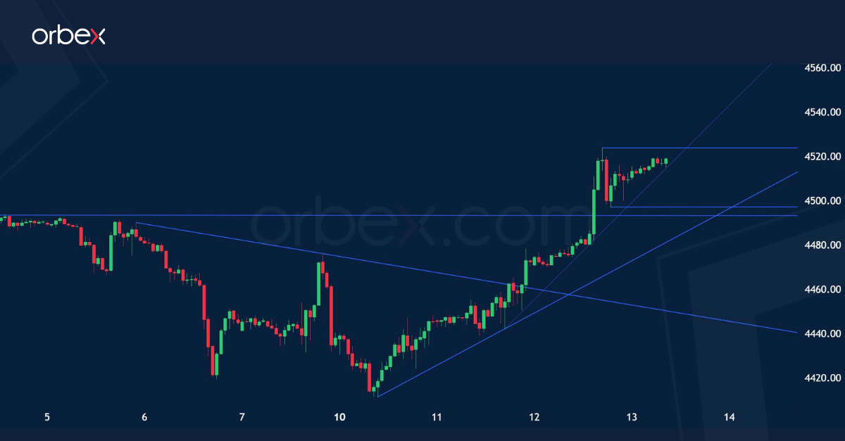 Der SPX500 hat gestern nach den besser als erwarteten Inflationszahlen alle Fesseln gesprengt und ist auf neue Highs davon gestürmt. Von dieser Dynamik lebt er auch heute. Ob die Rallye in dieser Intensität weitergehen kann, ist zwar fraglich. Doch vor allem wird nach unten nichts anbrennen. Das ist noch kein Markt, um auf der Shortseite per Tendenz dagegenzuhalten. – Es ist wahrscheinlich, dass heute mindestens ein weiteres Hoch über dem gestrigen bei 4.523,75 folgen wird. Kann der SPX500 das dann noch einmal durchsetzen, sind ihm nach oben erst einmal weiterhin keine Grenzen gesetzt. Kommt es bei 4.523,75 aber nur noch zu einem False-Breakout und Reversal, gerät die Rallye ins Stocken. Ein weiteres Konsolidierungssignal bringt auch ein Bruch des kurzfristigen Aufwärtstrends, der zur Stunde bei 4.516 verläuft. Auch dann geht die Luft erst einmal raus. Doch das Rückschlagpotential bleibt jetzt begrenzt und sehr überschaubar. Für das Maximum steht ein Pullback bis zur Zone am alten Hoch bei 4.494 und am gestrigen Reaktionstief bei 4.497. Wird sie heute erreicht, bedeutet das die beste antizyklische Chance des Tages auf der Longseite.