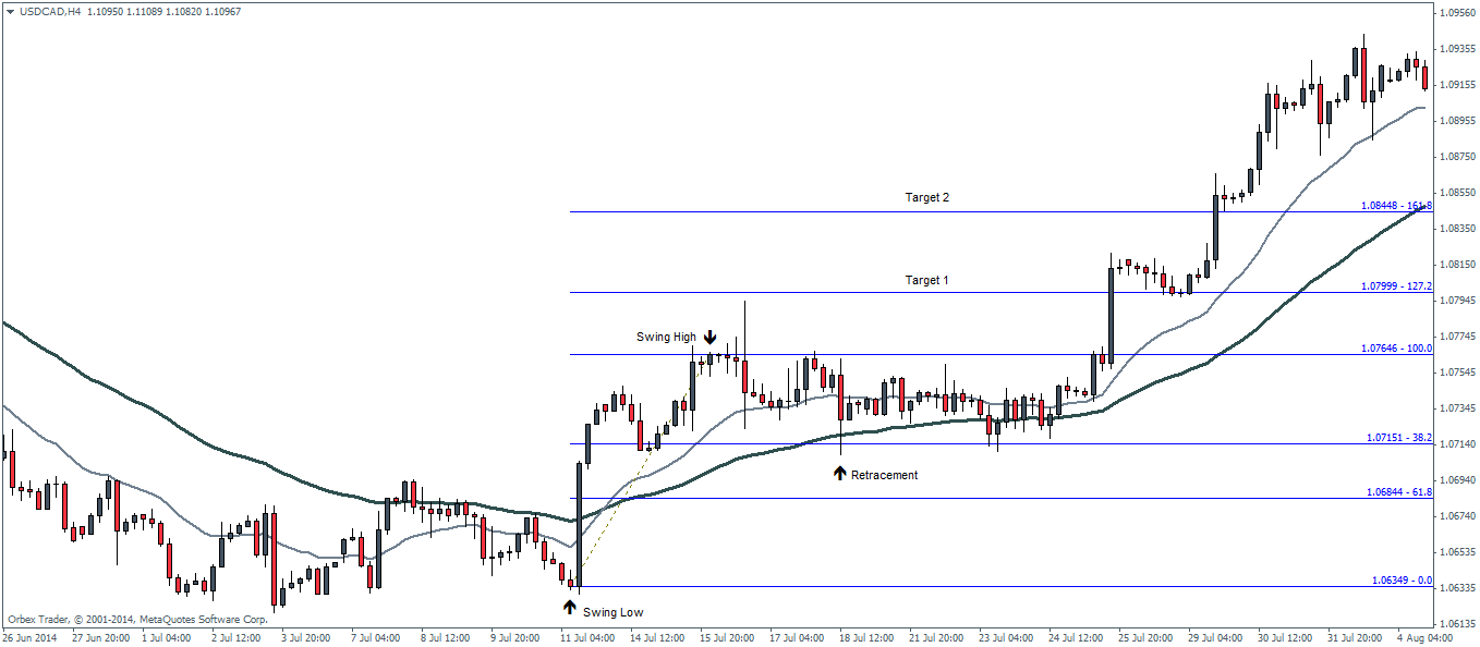 - Ensure that the 38.2% retracement is close to the 55 EMA. If the 38.2% retracement level is far below the longer term EMA, then wait for price action to give further clues