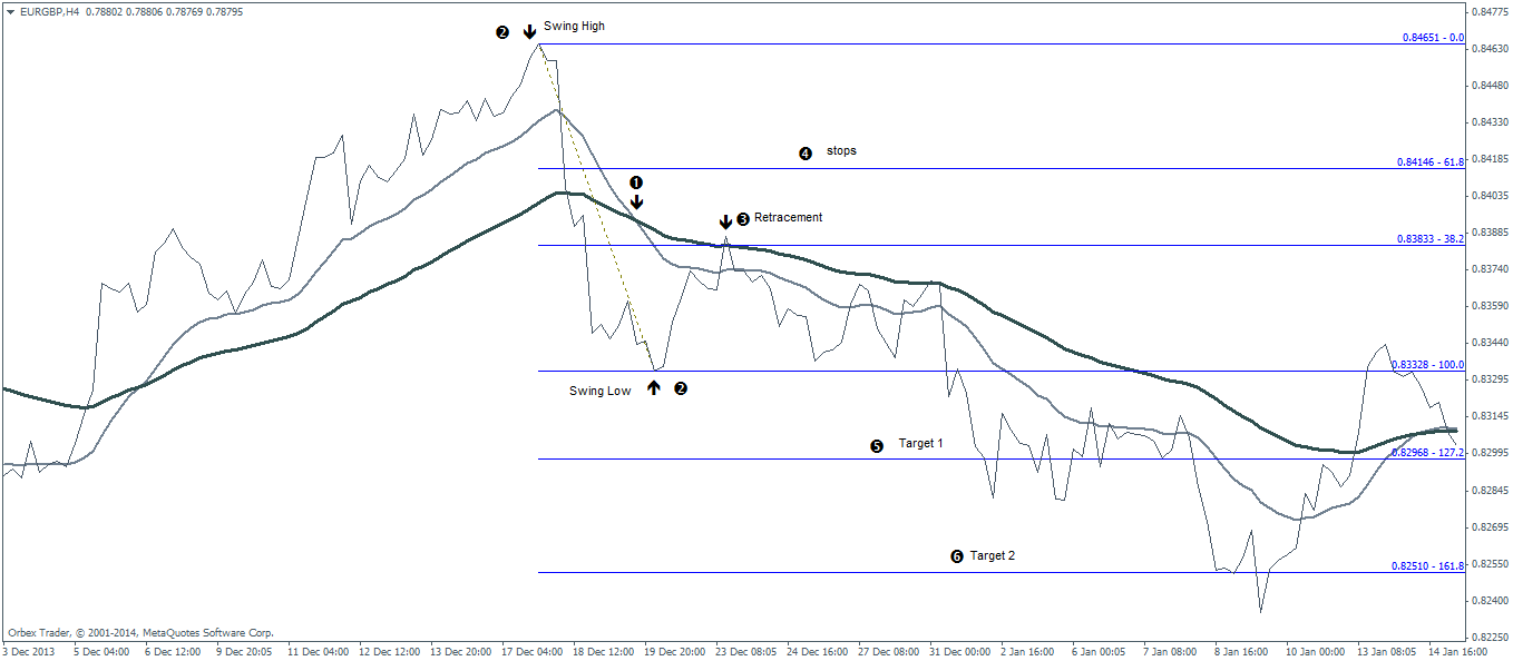 - Switching to line charts, we use the Fib tool to measure the first swing high and the last swing low prior to and after the bearish EMA crossover