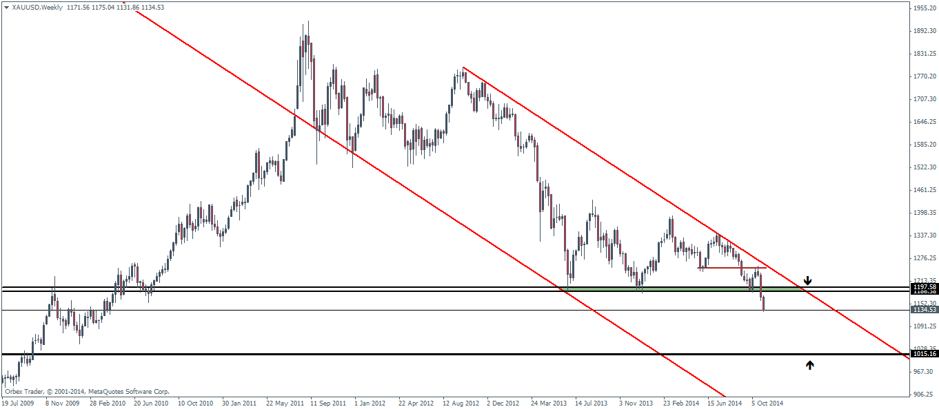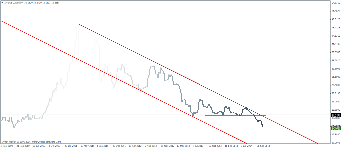 The above weekly chart for Gold shows the familiar support region being finally broken last week with the next support coming in at 1015. However, we could expect to see a brief corrective rally back to the 1180 region before Gold can think of further declines, trading steadily within a very long term price channel.