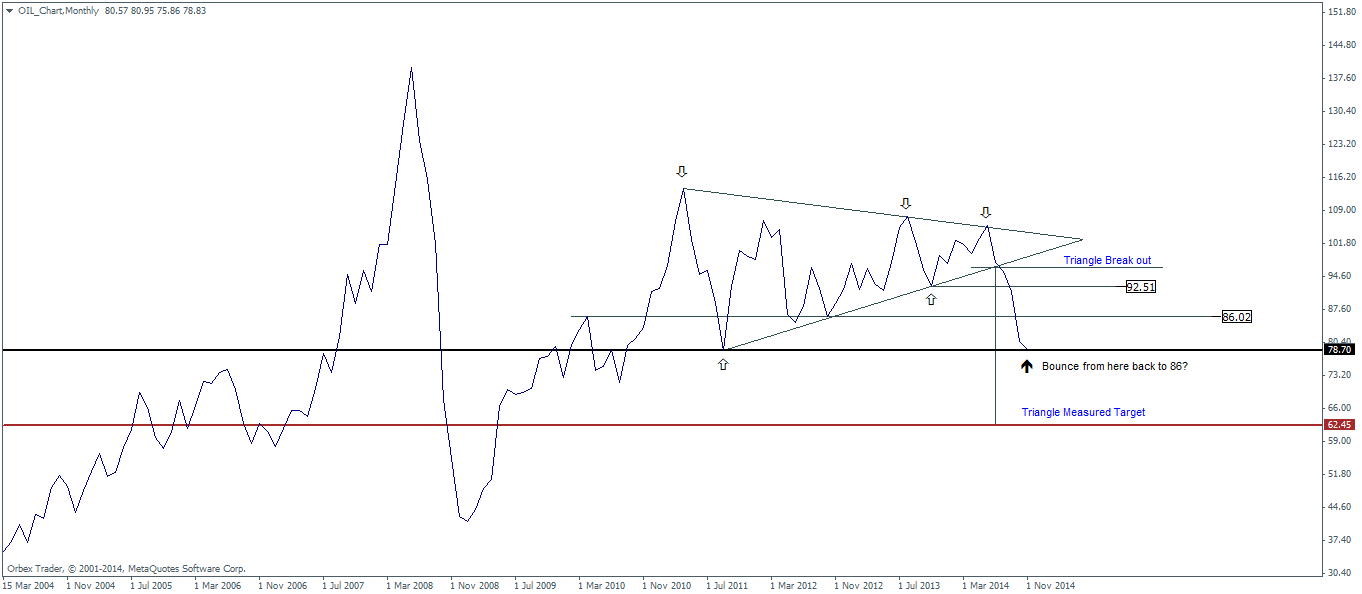 The updated monthly Crude Oil chart with the symmetrical triangle continues to be the chart to follow. Prices hit the first support level at 78.70. From here on, if the support holds, a brief rally to the region of 82 can be expected before Crude makes a nose dive to break the support at 78.7 levels.