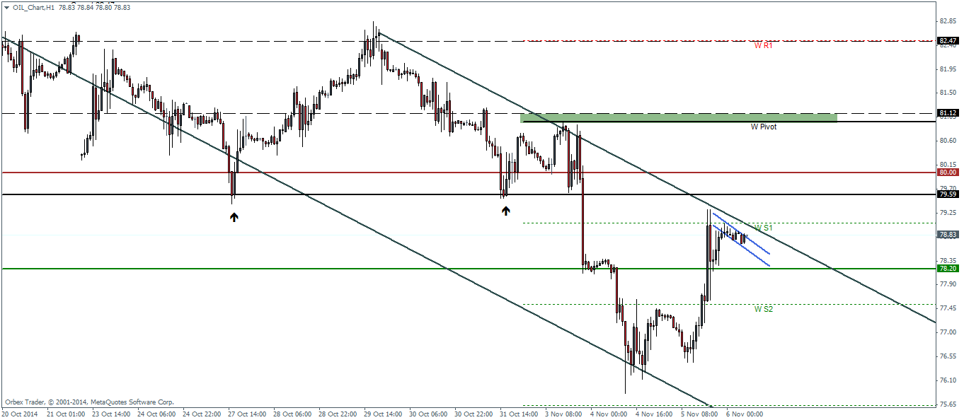 Following up to the H1 charts and updated with the new price action since last week’s Crude Oil analysis, we can see a brief consolidation taking shape at the time or writing with what seems like a bull flag/pennant formation. A break out from this consolidation phase is likely to see Crude oil aiming for the psychological level of $80 followed by a possibly brief rally towards the weekly pivot level region near 81.12