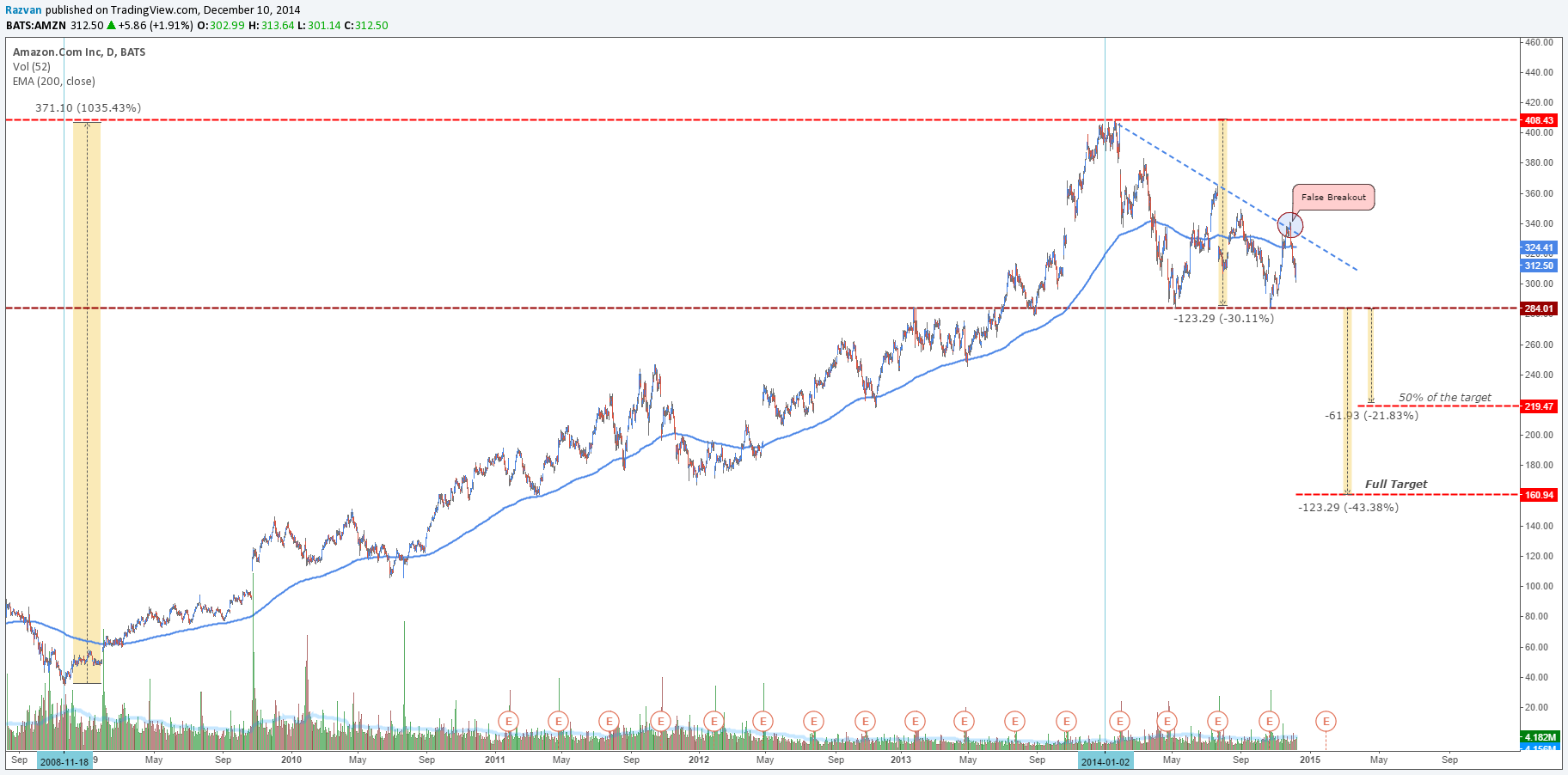 From the beginning of 2014 the shares were traded at an average price of $330, but it actually managed to lose 30%, hitting a low at $284. From the technical analysis perspective a Descending Triangle was drawn during this entire year. A break below the low of this year (considered to be the base of the triangle) will trigger a bigger drop. The price pattern’s targets are sitting at $220 (50% of the full target) and $161 the full potential of the fall in case of triggering.